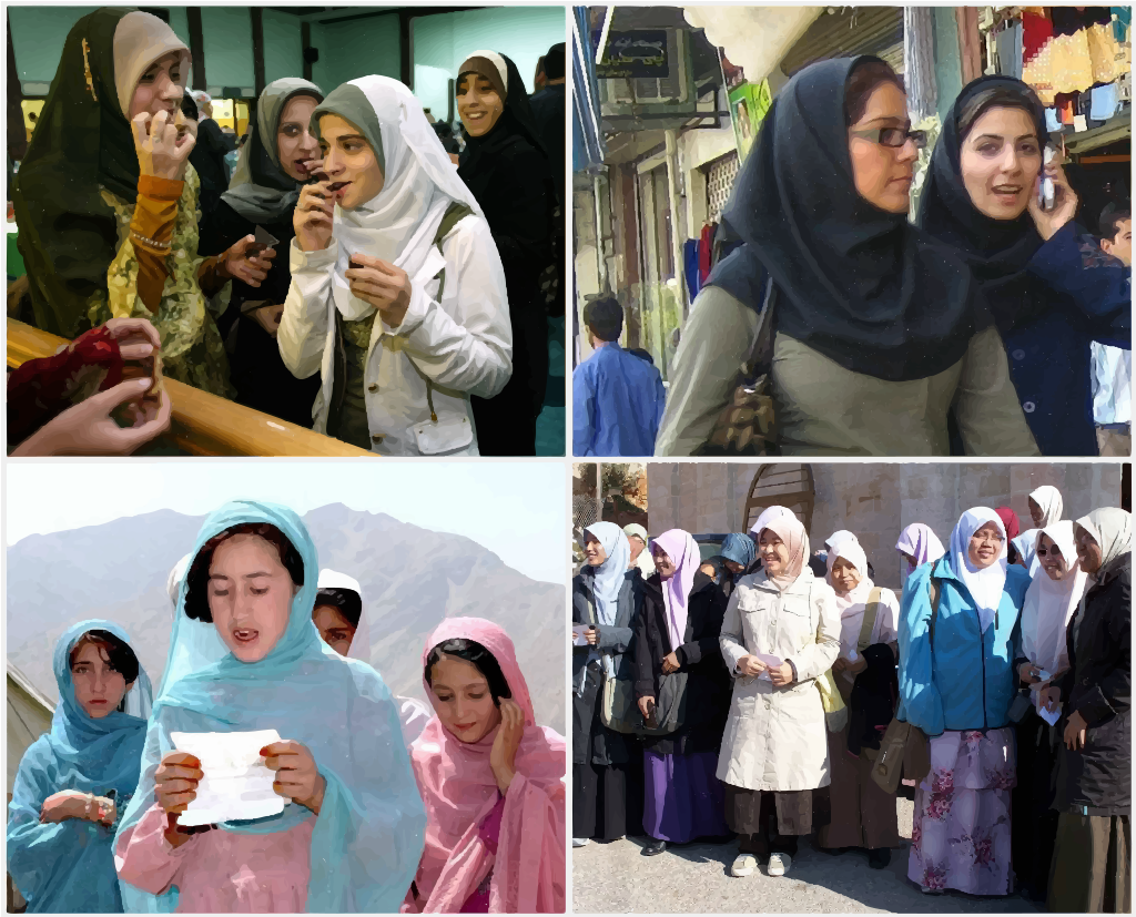 This is a collage of four pictures featuring women in various settings. In the first picture, two girls are standing next to each other and talking on their cell phones. In the second picture, there is a group of people gathered around a table, with some of them wearing headscarves. A woman can be seen holding a book while another person is holding a cell phone. The third picture shows a group of women in a courtyard, and one of them is holding a handbag. In the fourth picture, there are two girls standing next to each other, with one of them wearing a headscarf. A woman can be seen talking on her cell phone while another person holds a book. The collage captures different moments in the lives of these women and showcases their various activities.