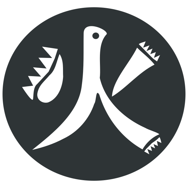 This features a black and white circle with various symbols, including a bird, a knife, and an umbrella. The bird is positioned in the top left of the circle, while the knife is located towards the center-left side. The umbrella can be found on the right side of the circle, extending from the middle to almost the edge of the image. These symbols are arranged around a central point, creating an intriguing and visually appealing composition.