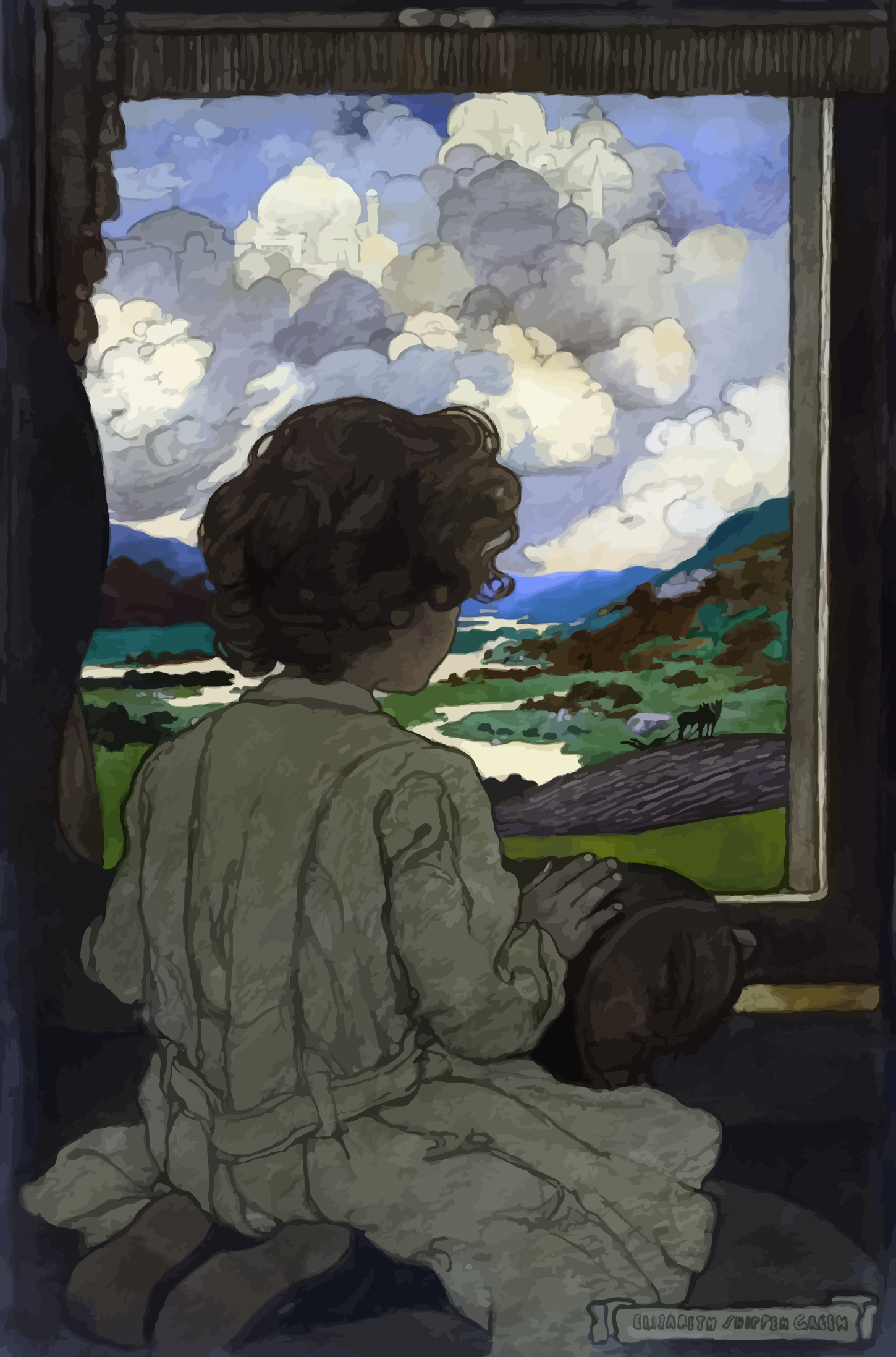 This depicts a young woman sitting in front of a window, looking out at the beautiful landscape. She is wearing a white dress and appears to be enjoying her time by the window. In the scene outside, there are several cows grazing on the grass, adding to the serene atmosphere. A book can also be seen placed near the woman, suggesting she might be reading while taking in the view. The overall setting is peaceful and inviting, with a sense of tranquility that comes from being surrounded by nature.