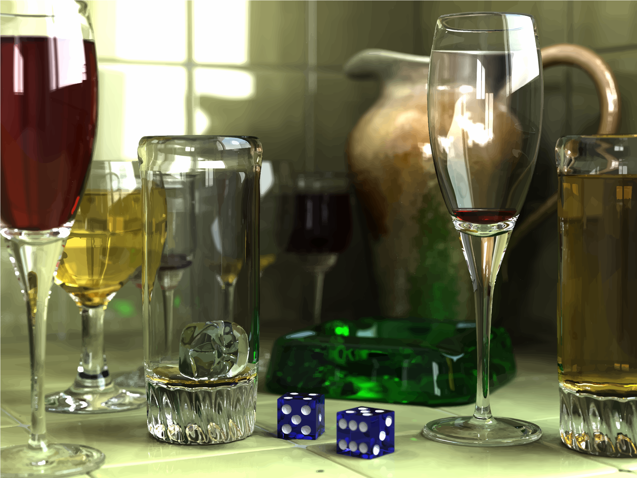 Tags: 3d, ashtray, counter, dice, glasses, kitchen, light, pitcher, reflection, refraction, rendered, sunlight, wine, glass, drink