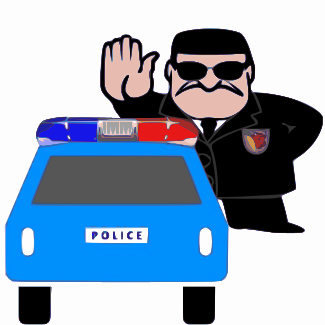 This features a cartoon police officer standing next to a blue car. He is wearing sunglasses and has his hand up, giving the impression of waving or signaling. The car appears to be a police vehicle, as indicated by its color and the presence of a police logo on it. The cartoon character seems to be in a playful mood, possibly making light of the situation or simply enjoying himself.
