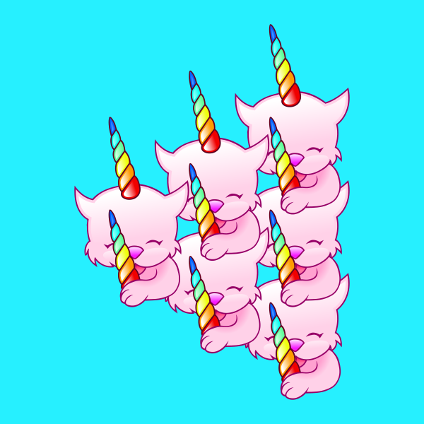 This features a group of six pink unicorns sitting next to each other. Each unicorn has a horn on its head, which is colorful and adds to the whimsical nature of the scene. These cute creatures are arranged in a row, with some positioned closer together than others, creating an appealing visual effect. The overall composition of the image showcases these adorable unicorns as they sit next to each other on a blue background.
