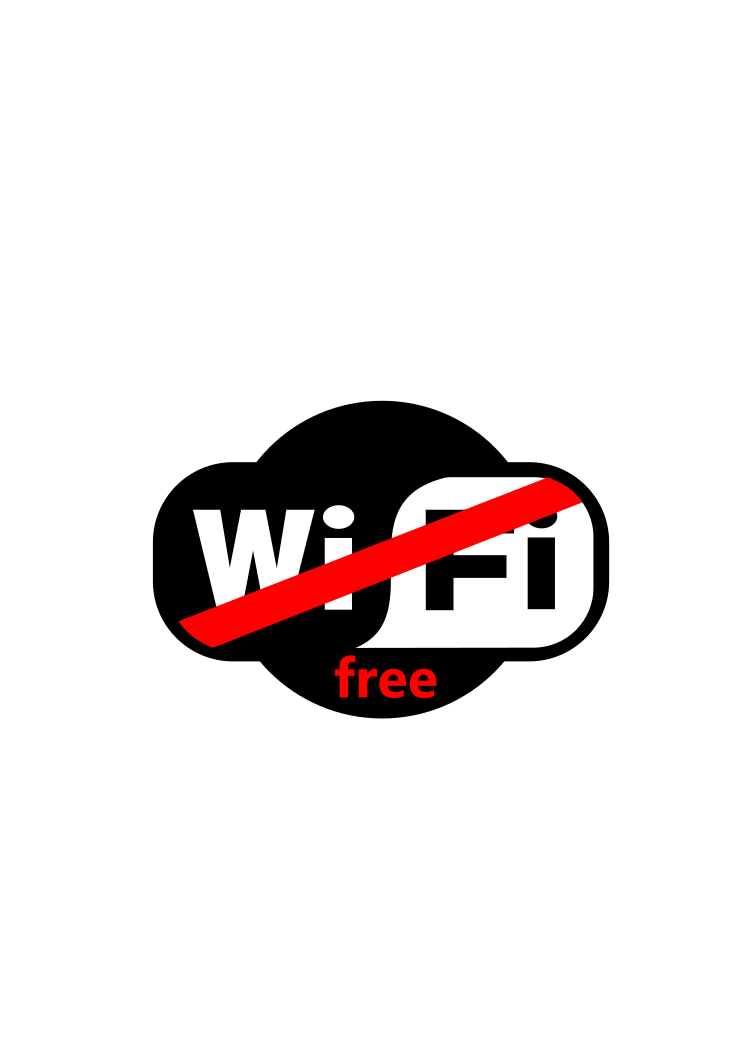 This features a black and white logo for Wi-Fi free zones. This designation is meant to indicate that the area does not have access to wireless internet, providing an alternative space for people who need to avoid or limit their exposure to electronic devices. The Wi-Fi free zone logo is displayed prominently in the center of the image, with a white background surrounding it.