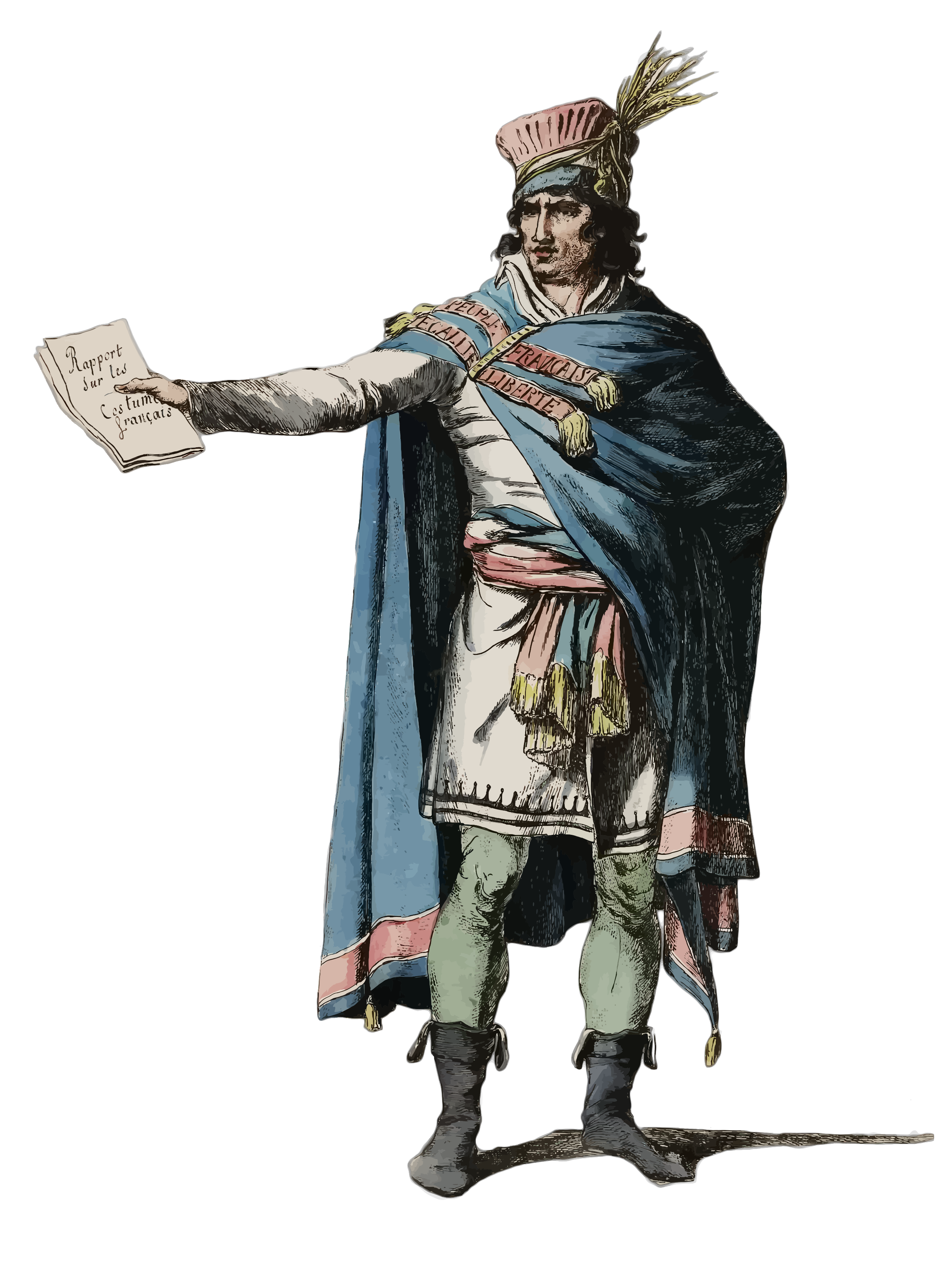 This features a man dressed in an elaborate costume, wearing a blue and white robe. He is holding papers in his right hand while pointing to the left with his finger. The man appears to be a writer or possibly a character from a historical period. His attire suggests that he might be of royal or noble status, as indicated by the colorful robes and the fact that he is holding papers. The overall scene gives off an air of importance and authority, as if the man were addressing an audience or making an important announcement.