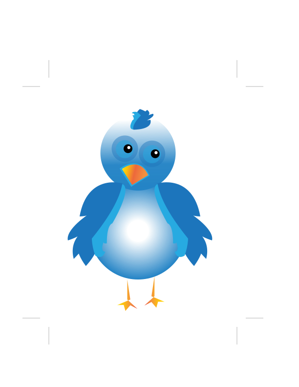 This features a cartoon blue bird standing on two orange feet. It has an orange beak and is positioned in the center of the frame. The bird appears to be looking at something, possibly towards the viewer or another part of the scene. Its vibrant colors make it stand out against the white background, creating a visually appealing image that captures attention.