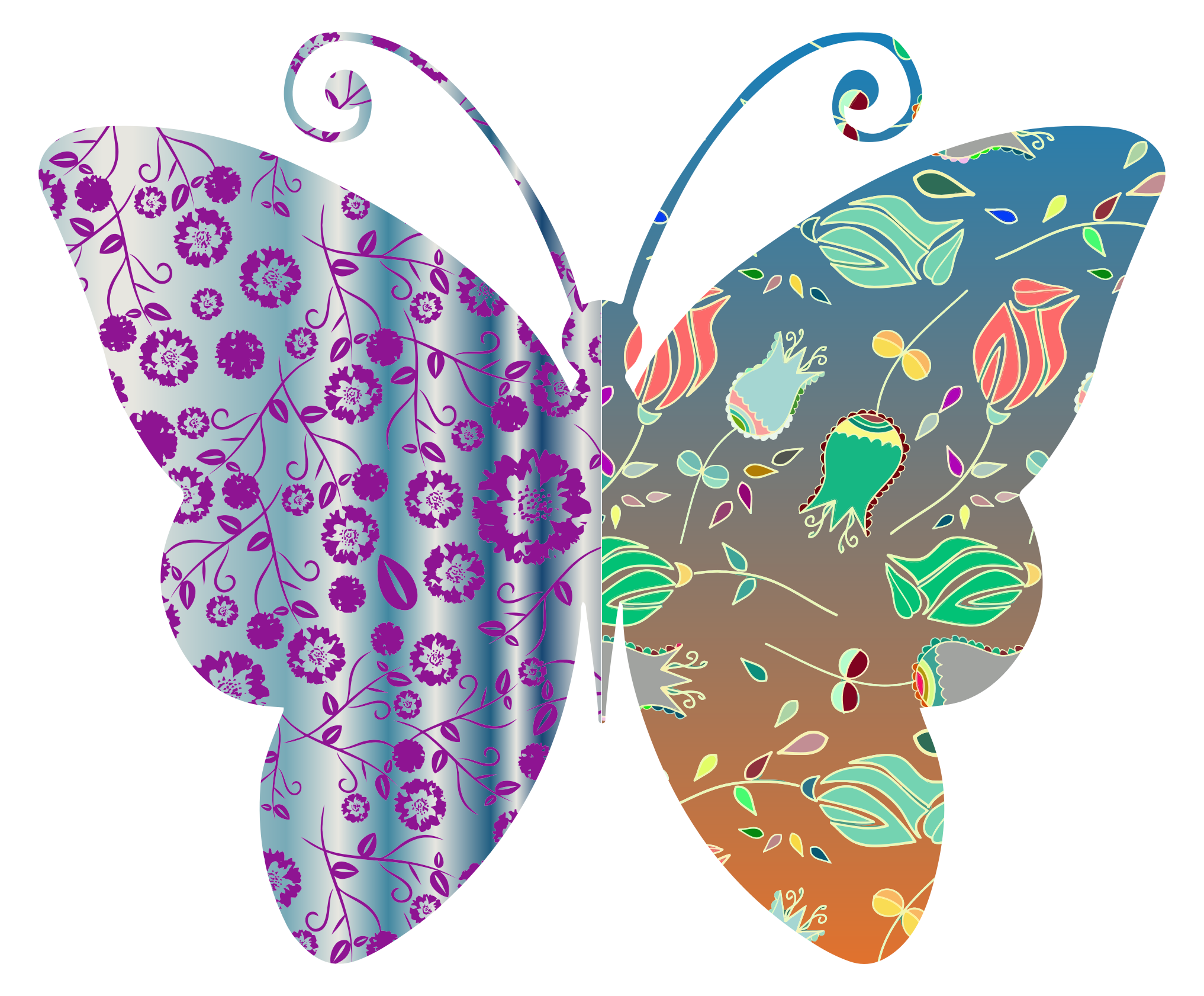 This features a butterfly with two different vintage-style patterns on its wings. One wing is purple, while the other is orange and yellow. The butterfly's wings are open, showcasing these unique designs. The colors of the butterfly are complemented by the colorful patterns on its wings, creating a visually appealing image.