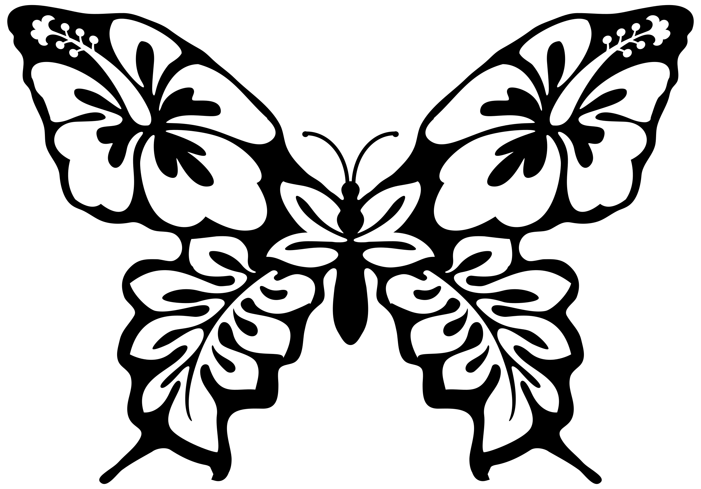 This features a black and white illustration of two butterflies. Each butterfly is positioned on the left side, with one slightly overlapping the other. They are both adorned with intricate tropical imagery, adding to their visual appeal. The butterflies appear to be in flight, creating a sense of motion and grace within the artwork. This lineart style illustration captures the beauty of these delicate creatures while showcasing the artist's skillful craftsmanship.