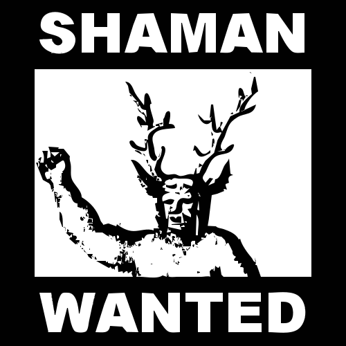 This is a black and white poster featuring an illustration of a shaman with antlers. The shaman appears to be wearing a loincloth, and the poster has text that reads "Shaman Wanted." The illustration gives off a vintage or ancient feel, possibly suggesting that the shaman is being sought after for some specific purpose or task.