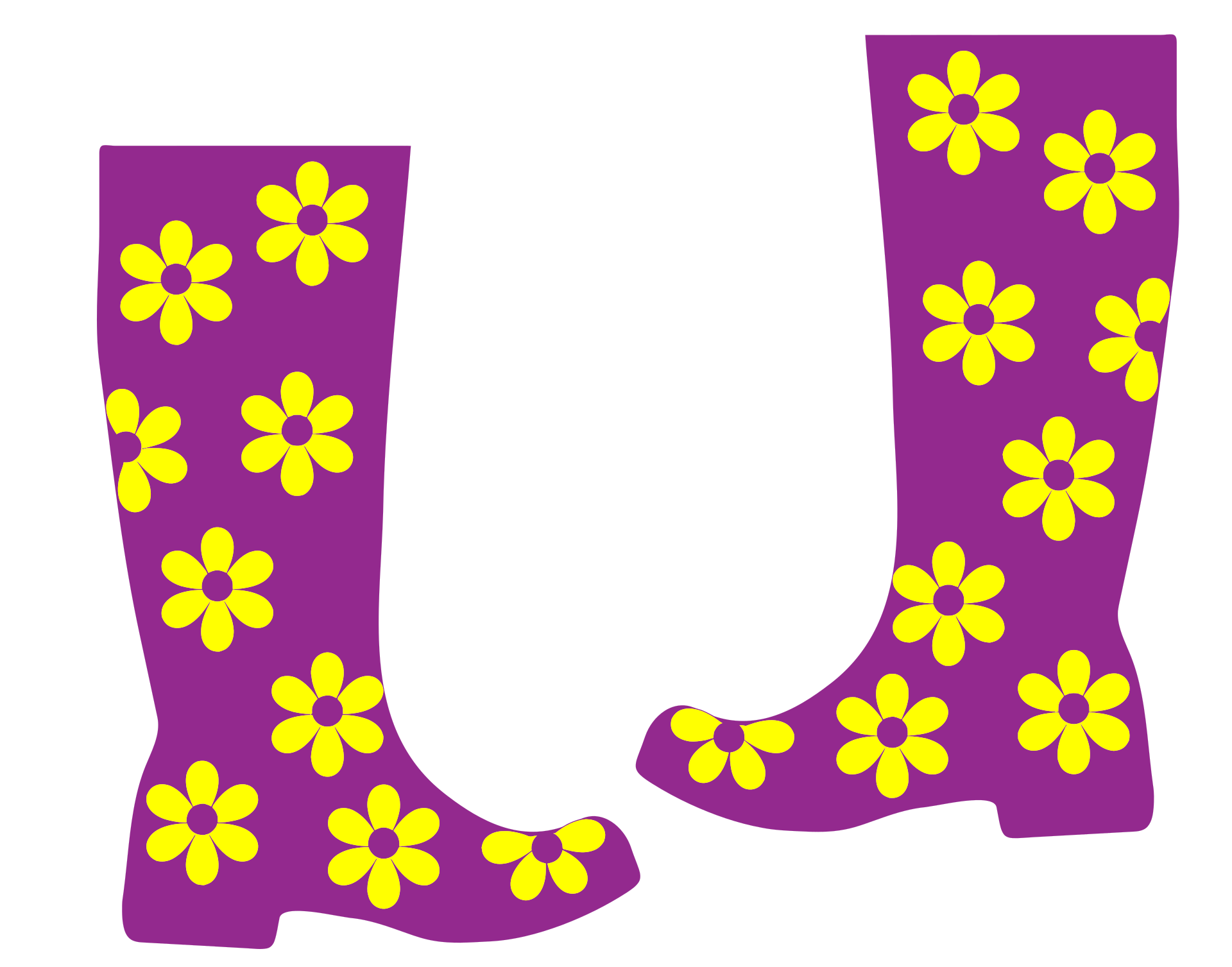 This features a pair of purple rain boots with yellow flowers on them. These boots are designed to keep the wearer dry and comfortable during rainy weather, while also adding a touch of color and style to their outfit. The boots have a large flower pattern on them, which adds visual interest and makes them stand out from other footwear options. The purple hue of the boots complements the yellow flowers, creating an eye-catching combination that is both practical and fashionable.