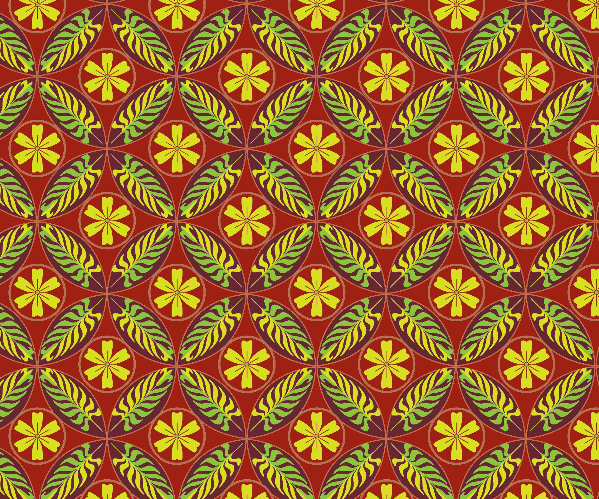 This features a red and yellow floral pattern, which is reminiscent of a peacock feather design. This pattern is repeated throughout the entirety of the image, creating a cohesive and visually appealing background. The colors used in this design are predominantly orange and yellow, with some green accents as well. The overall effect is one of vibrancy and warmth, making it an attractive choice for various applications such as wallpaper or fabric designs.