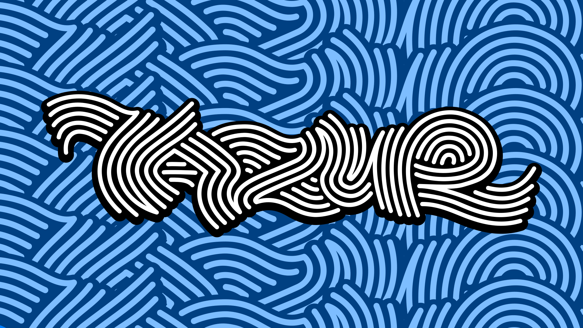 This features a blue and white design with an abstract pattern. In the center of this design, there is a word that appears to be "Tazir." This word is written in a unique style, giving it a distinctive appearance. The overall composition of the image creates a visually appealing and intriguing piece of artwork.