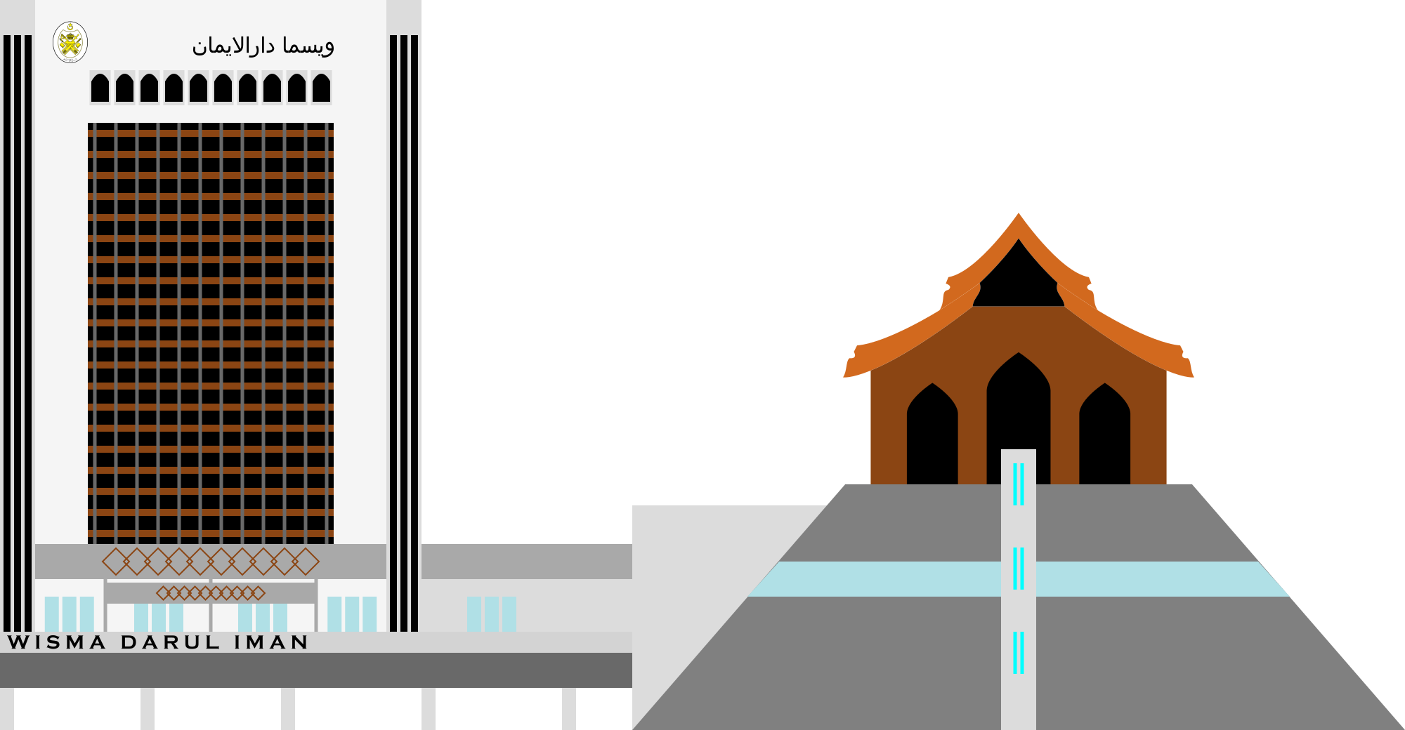 This features a large building with an ornate design, which is likely the Terengganu State Legislative Assembly hall (DUN Terengganu). This impressive structure stands out in the scene. In addition to this building, there are two other buildings visible in the background, one of which appears to be a church. A staircase can also be seen leading up to the top of the building, possibly providing access to an observation deck or another level within the structure. The overall atmosphere suggests that this location is a significant and visually appealing place for visitors and residents alike.