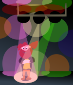 This features a small, colorful character standing in the center of a disco ball. This character appears to be a robot or an alien, and it is surrounded by various colored balls that create a vibrant atmosphere. The scene seems to be set on a stage with lights illuminating the area, giving the impression of a performance or show. The character's presence in this setting adds a unique touch to the overall visual experience.
