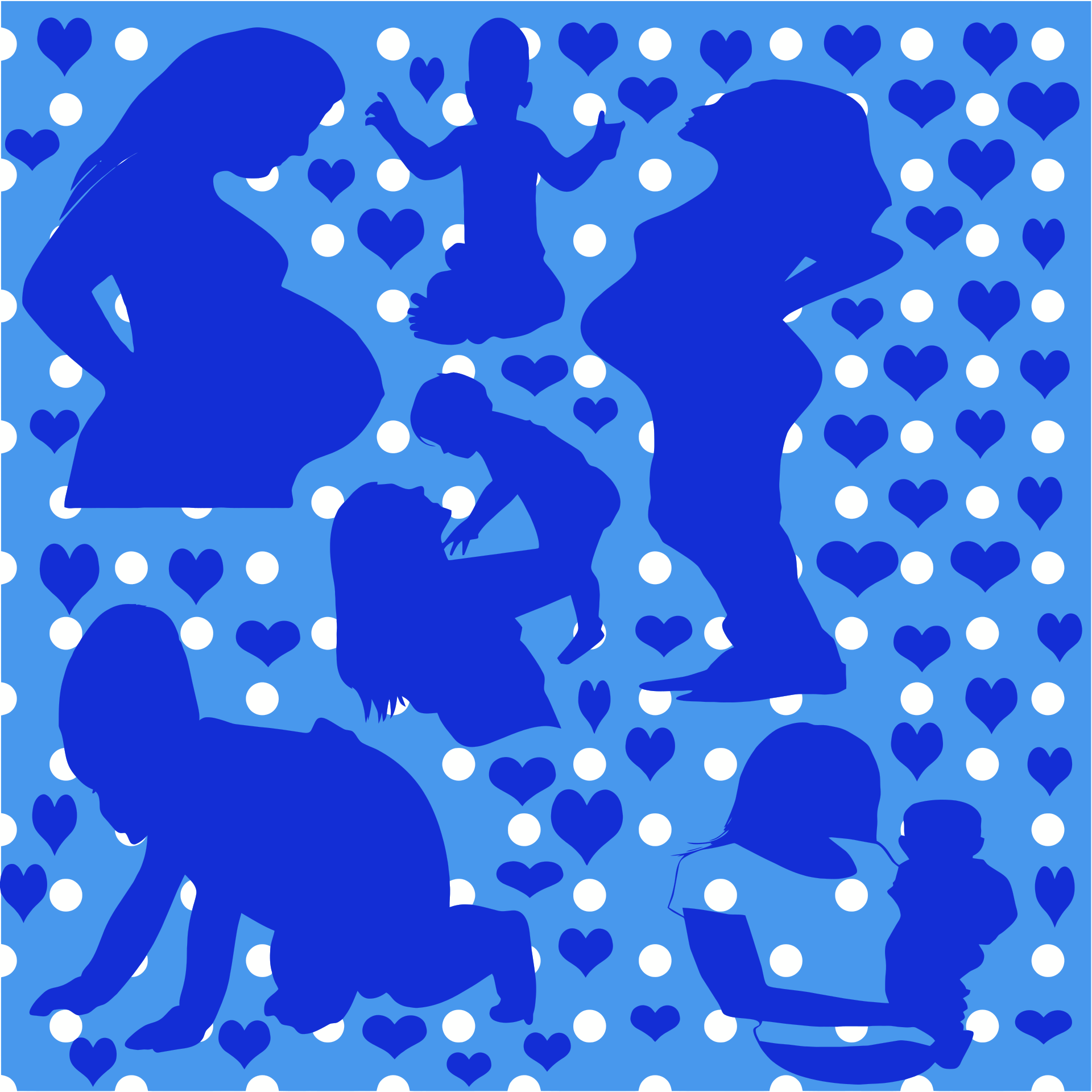 This features a collection of silhouettes of women in various poses, all set against a blue background with white hearts. There are nine distinct figures in total, each depicted at different angles and positions. Some of the women appear to be pregnant or have just given birth, as indicated by their postures and the presence of a baby in one of the silhouettes. The overall composition creates an artistic and visually appealing representation of these women's experiences.