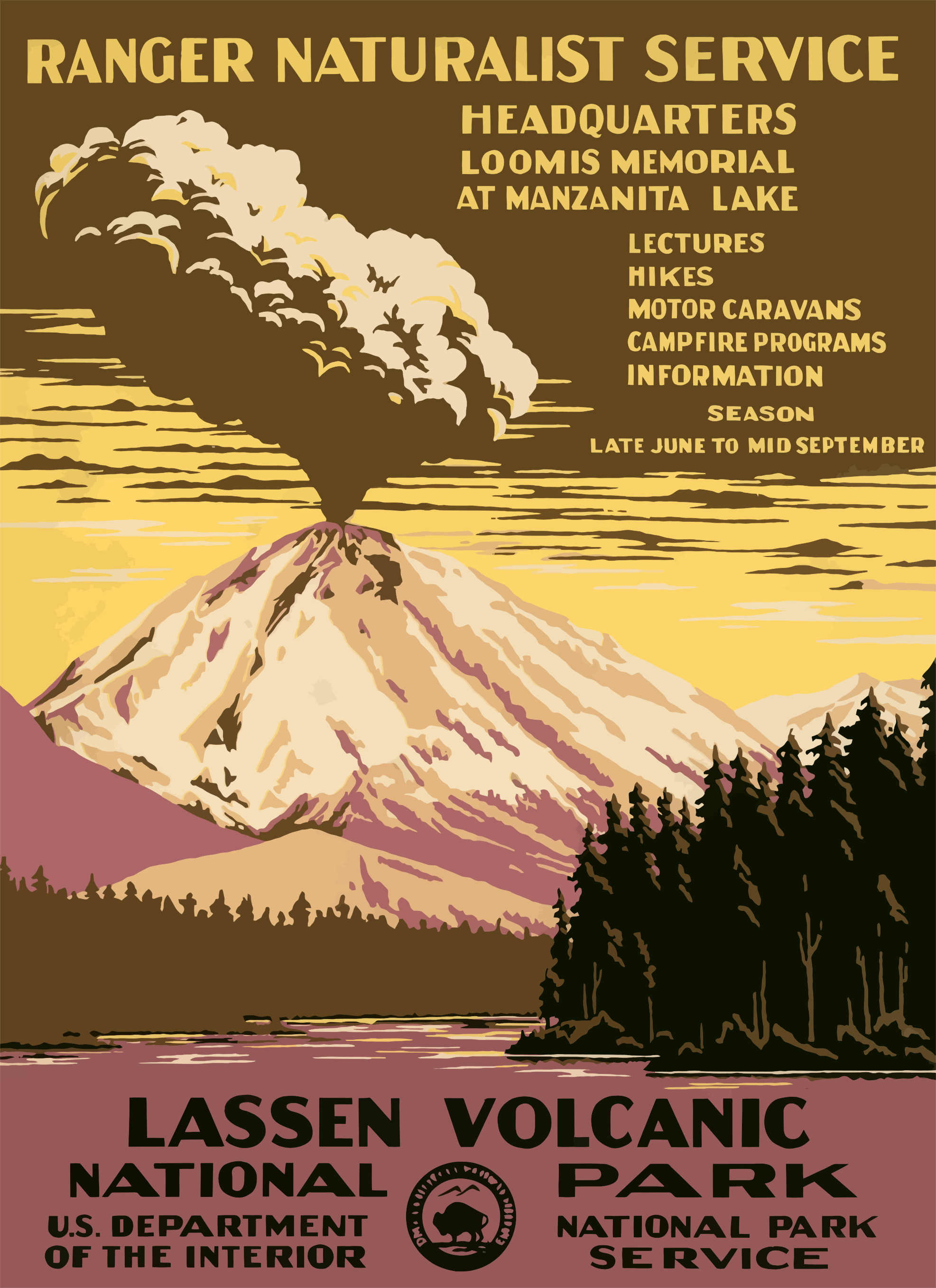 Tags: america, california, national park, poster, travel, usa, vintage, volcanic, ranger naturalist service, headquarters at manzanita lake, lassen volcanic national park, usa.