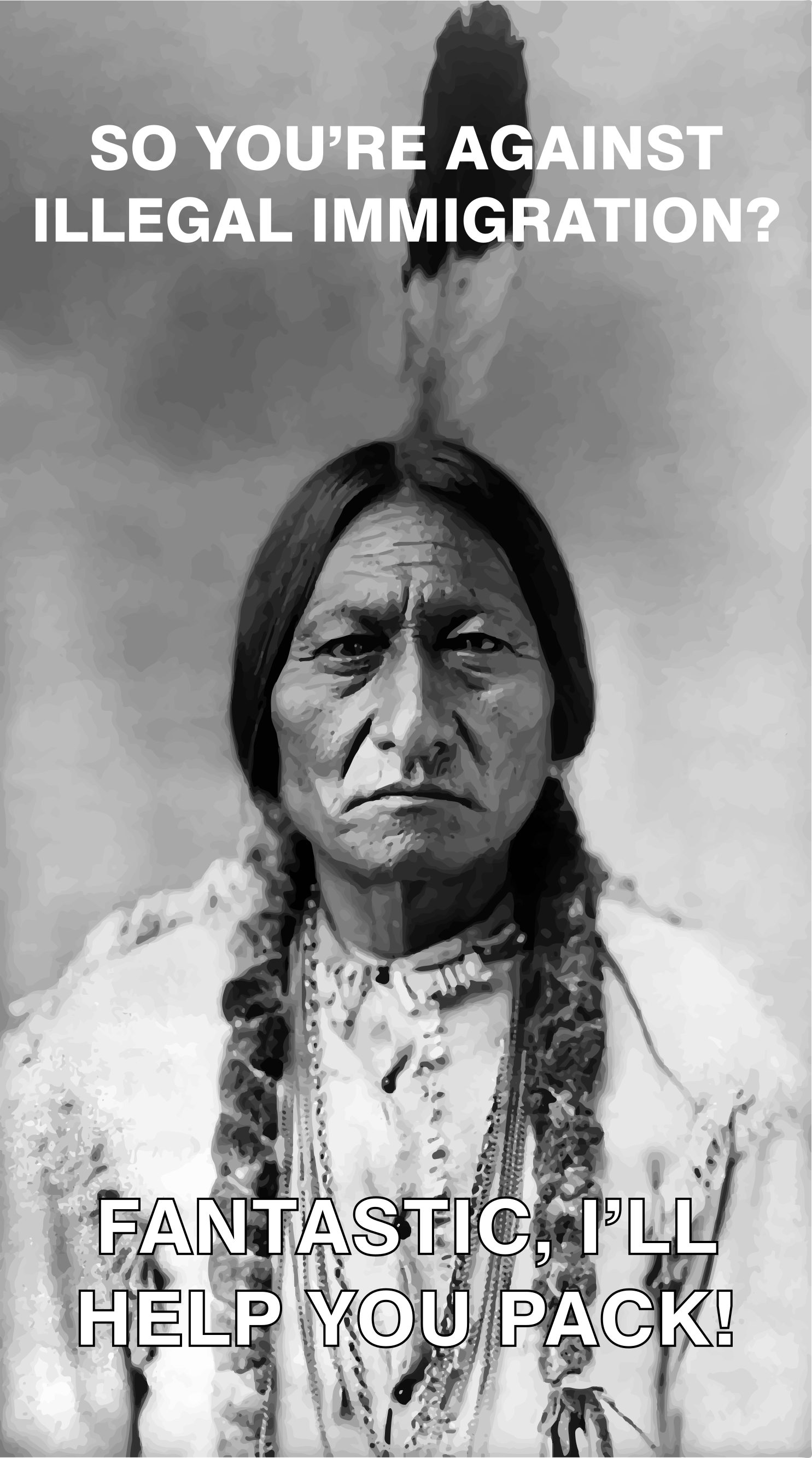 This features a Native American man with long hair and a feather in his head, staring directly at the camera. He appears to be wearing traditional Indian clothing, including a headdress. Above him, there is a caption that reads "So you're against illegal immigration? Fantastic, I'll help you pack!" This statement seems to be related to the ongoing debate about immigration policies and the man's appearance as a Native American could be interpreted as an example of cultural diversity.