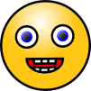 This features a yellow smiley face with blue eyes and teeth. The face is wearing a red mouth, giving it an animated appearance. The eyes are wide open, adding to the playful nature of the character. This cartoon-like expression makes for a cheerful and friendly representation.