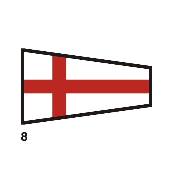This features a white flag with red stripes, resembling the British flag. It is displayed in a square shape and has a number eight written on it. This design could be used for various purposes such as decoration or identification. The flag's unique appearance makes it stand out against its surroundings.