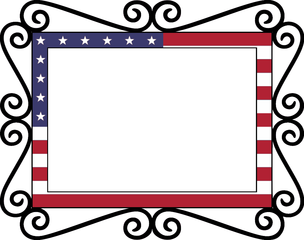 This features a decorative picture frame with an American flag design. The frame is adorned with swirls and scrolls, giving it a fancy appearance. Inside the frame, there is a white background that contrasts nicely with the red, white, and blue colors of the flag. The overall effect creates a patriotic and elegant display.