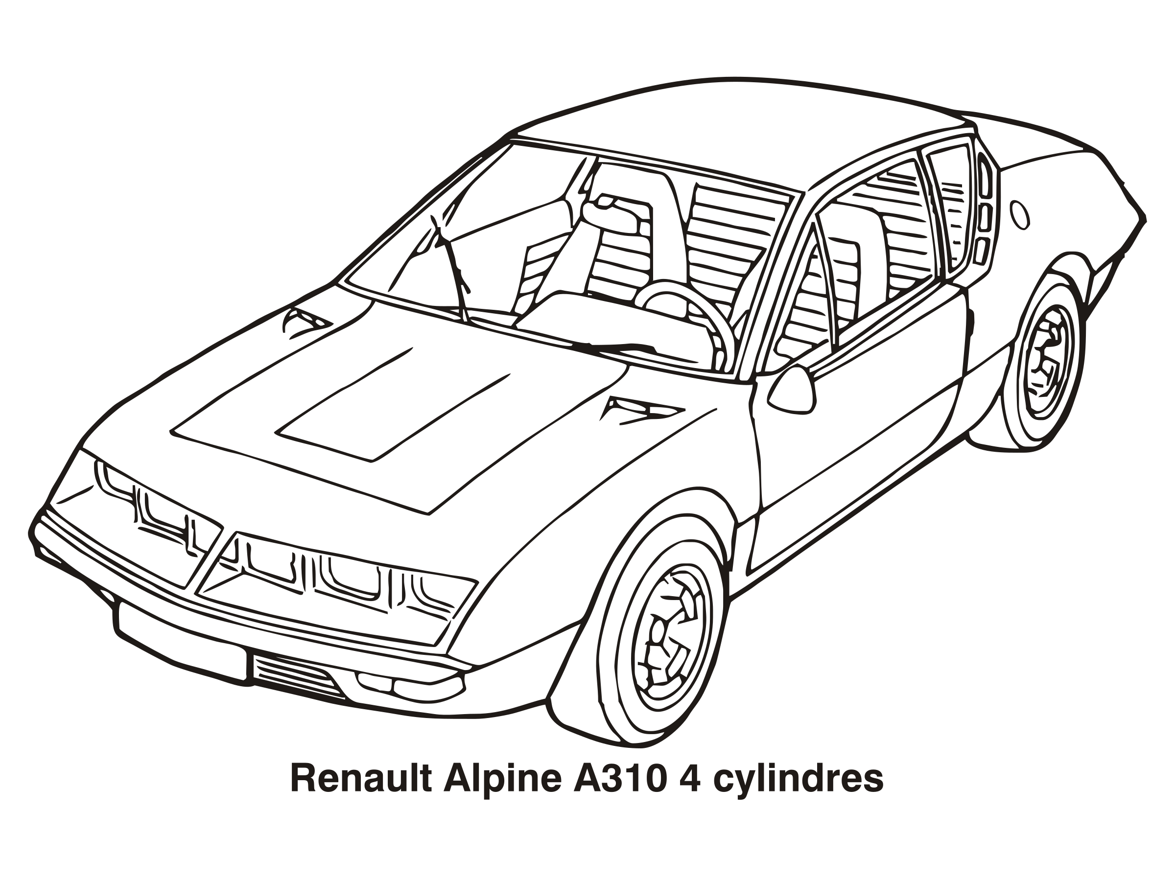 This is a black and white drawing of an old Renault Alpine A310 sports car. It features a sleek design with a windshield, side windows, and a rear window. The car has four wheels, each with its own tire. There are two people visible in the drawing, one on the left side and another on the right side of the car. They appear to be enjoying their time in this classic sports car.