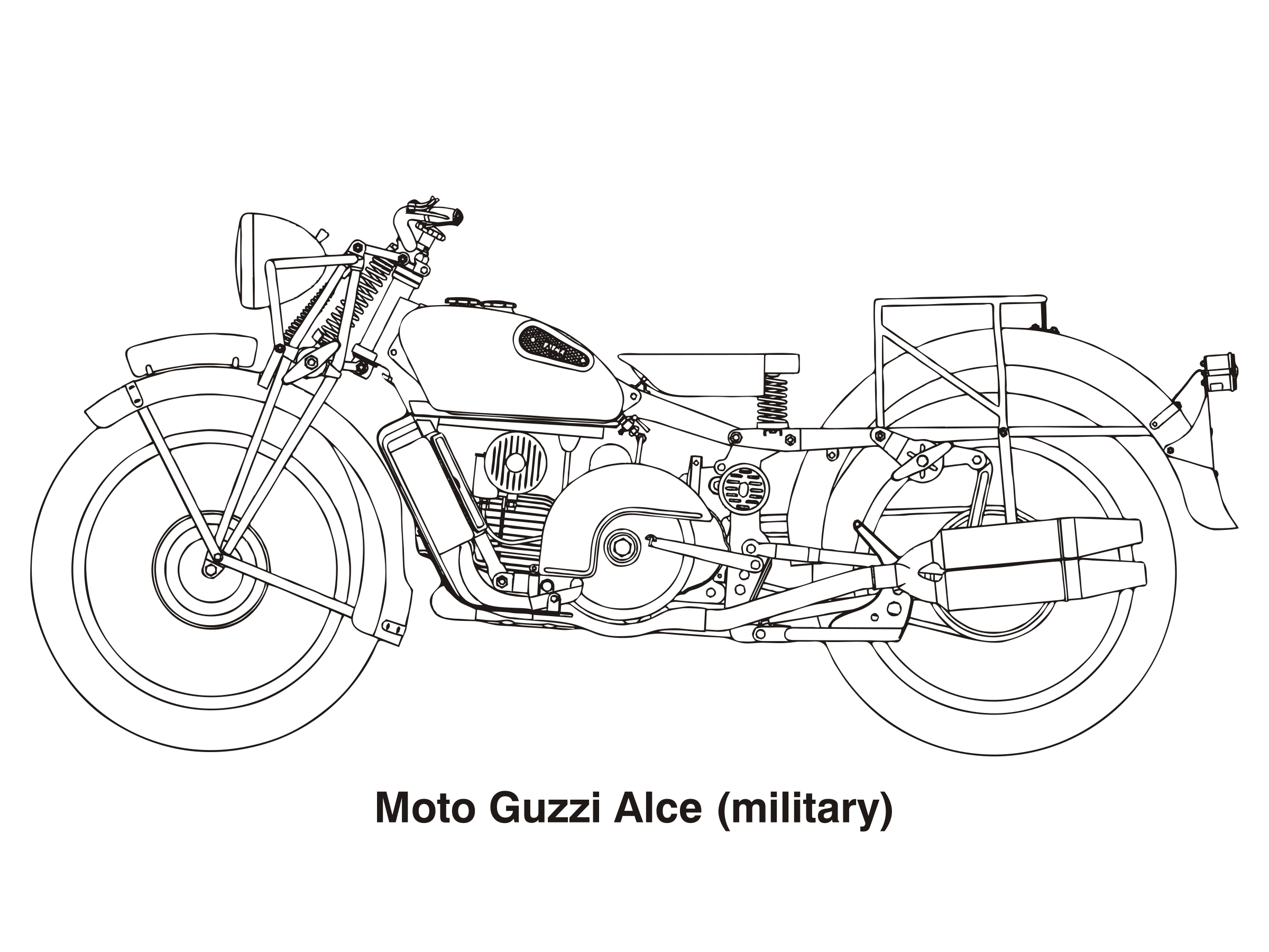 This is a black and white drawing of a motorcycle, specifically a Moto Guzzi Alice. It features the front end of the motorcycle with its wheel and handlebars prominently displayed. The motorcycle has a military theme, which can be seen in the design elements such as the tank and other parts of the bike. The drawing is detailed enough to showcase the intricate details of the motorcycle's components, making it an interesting piece of artwork.