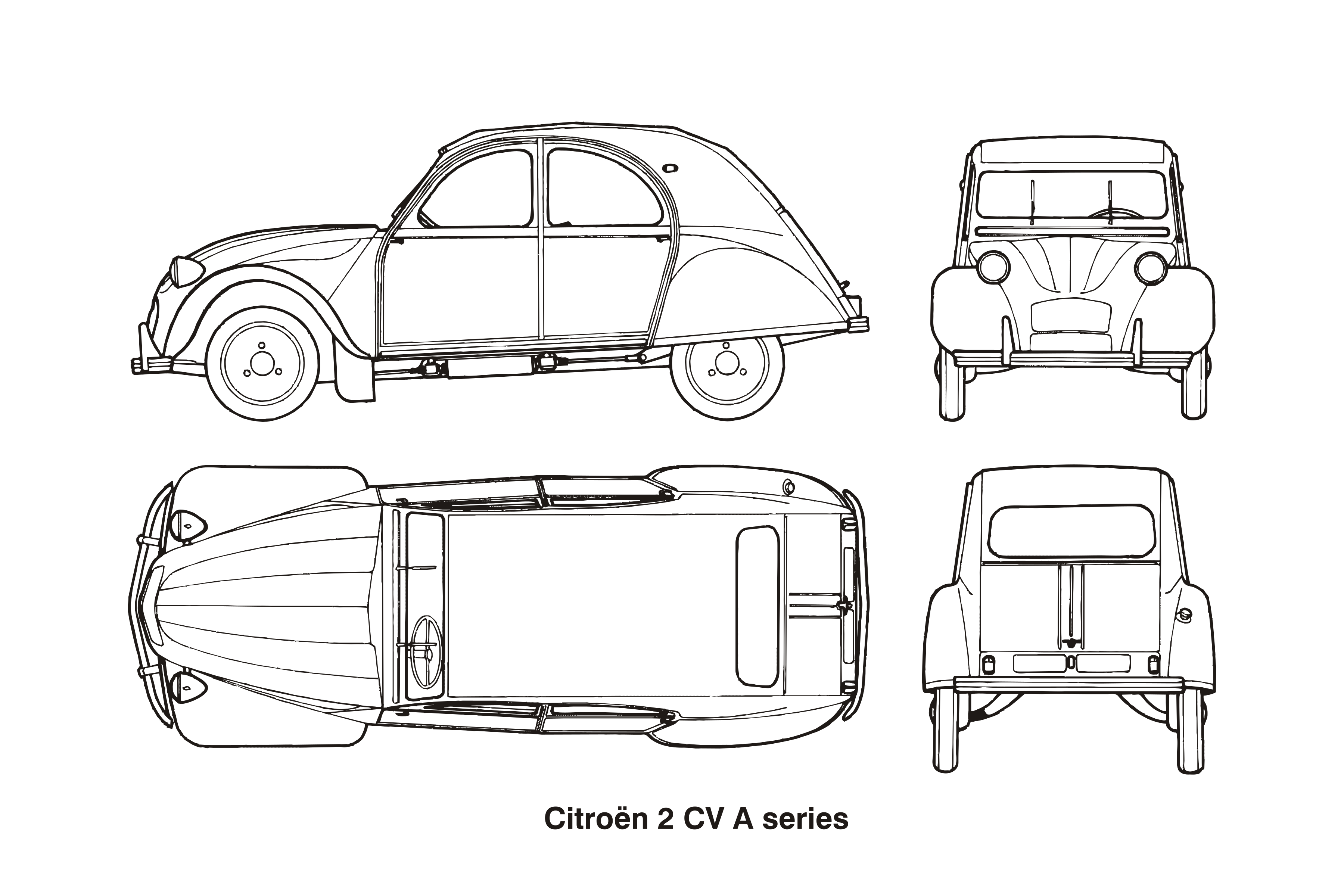 This is a black and white drawing of four different angles of a Citroen car. Each angle showcases the unique features of the vehicle, providing an interesting perspective on its design. The car appears to be a classic model, with a vintage charm that stands out in the drawing. The various angles capture the essence of the car's structure and highlight its distinctive elements, making it an appealing visual representation of this iconic automobile brand.