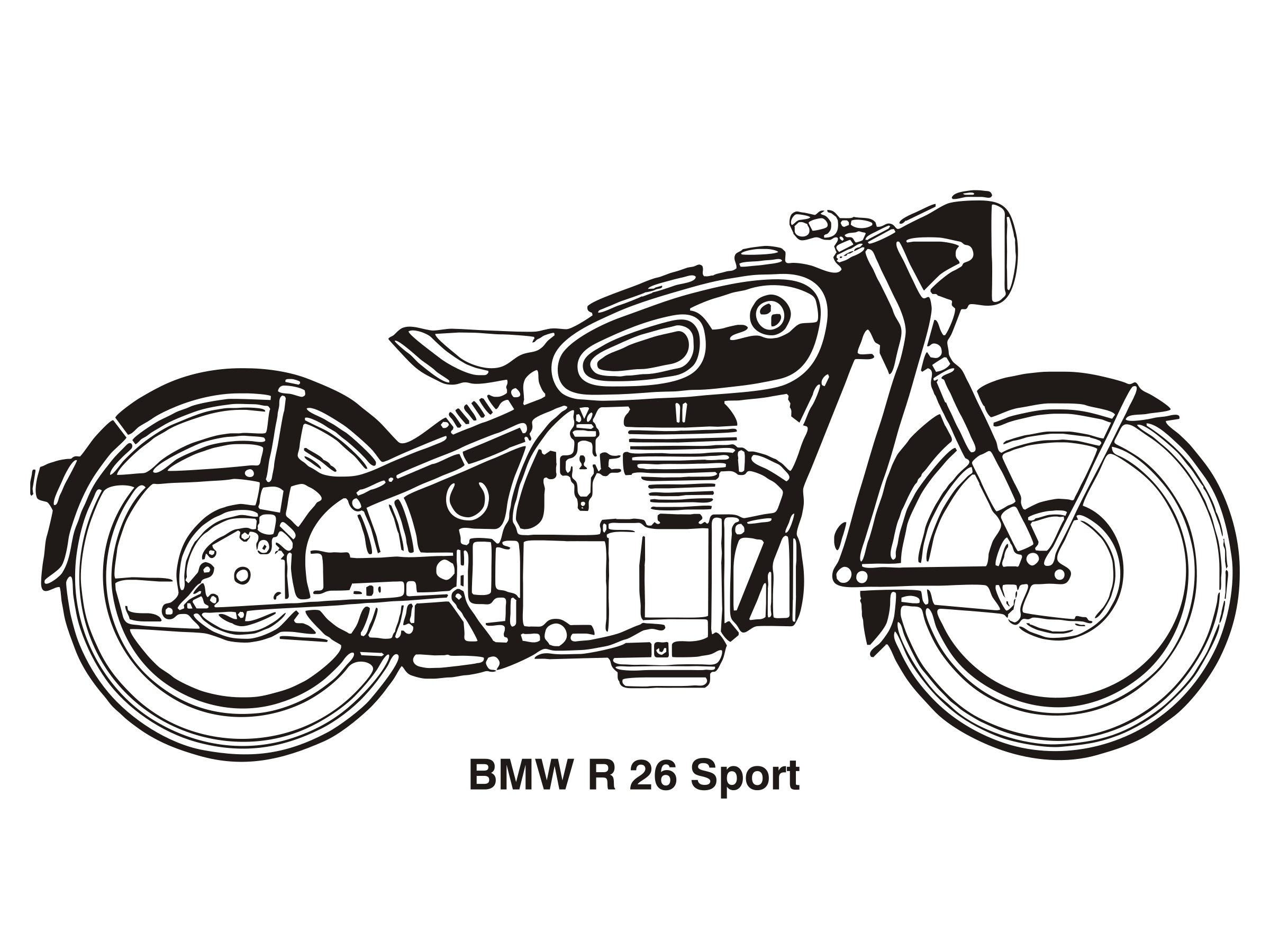 This features a black and white drawing of a motorcycle, likely an old BMW R26 Sport model. The motorcycle is prominently displayed in the center of the picture with its front wheel visible on the left side. The rear wheel can be seen on the right side of the image. The drawing captures the essence of the motorcycle's design, showcasing its unique features and details. It appears to be a close-up view of the bike, emphasizing its structure and components. This artistic representation of the BMW R26 Sport model is an interesting visual representation of this classic motorcycle.