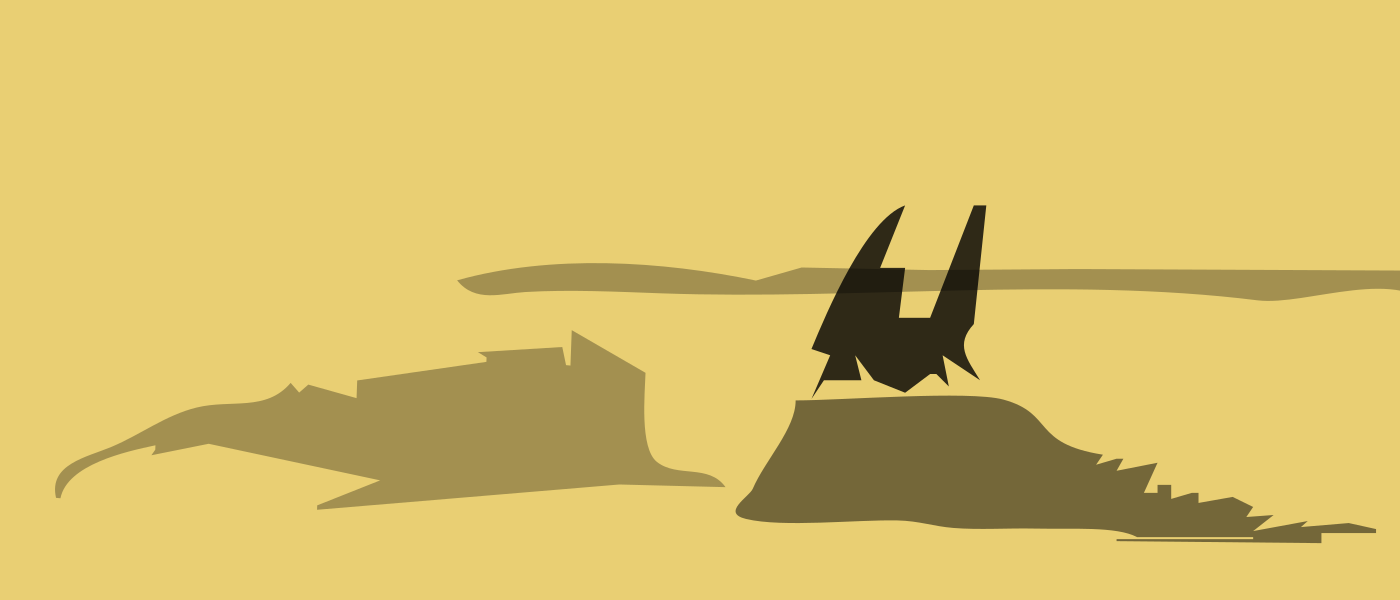 This features a desert landscape with an interesting mix of objects. In the foreground, there is a spaceship that has landed in the sandy terrain, likely searching for treasure. This spaceship appears to be black and stands out against the backdrop of the desert. Additionally, there are two birds flying above the scene, one closer to the left side and another towards the right side of the image. The presence of these birds adds a dynamic element to the otherwise static desert environment.