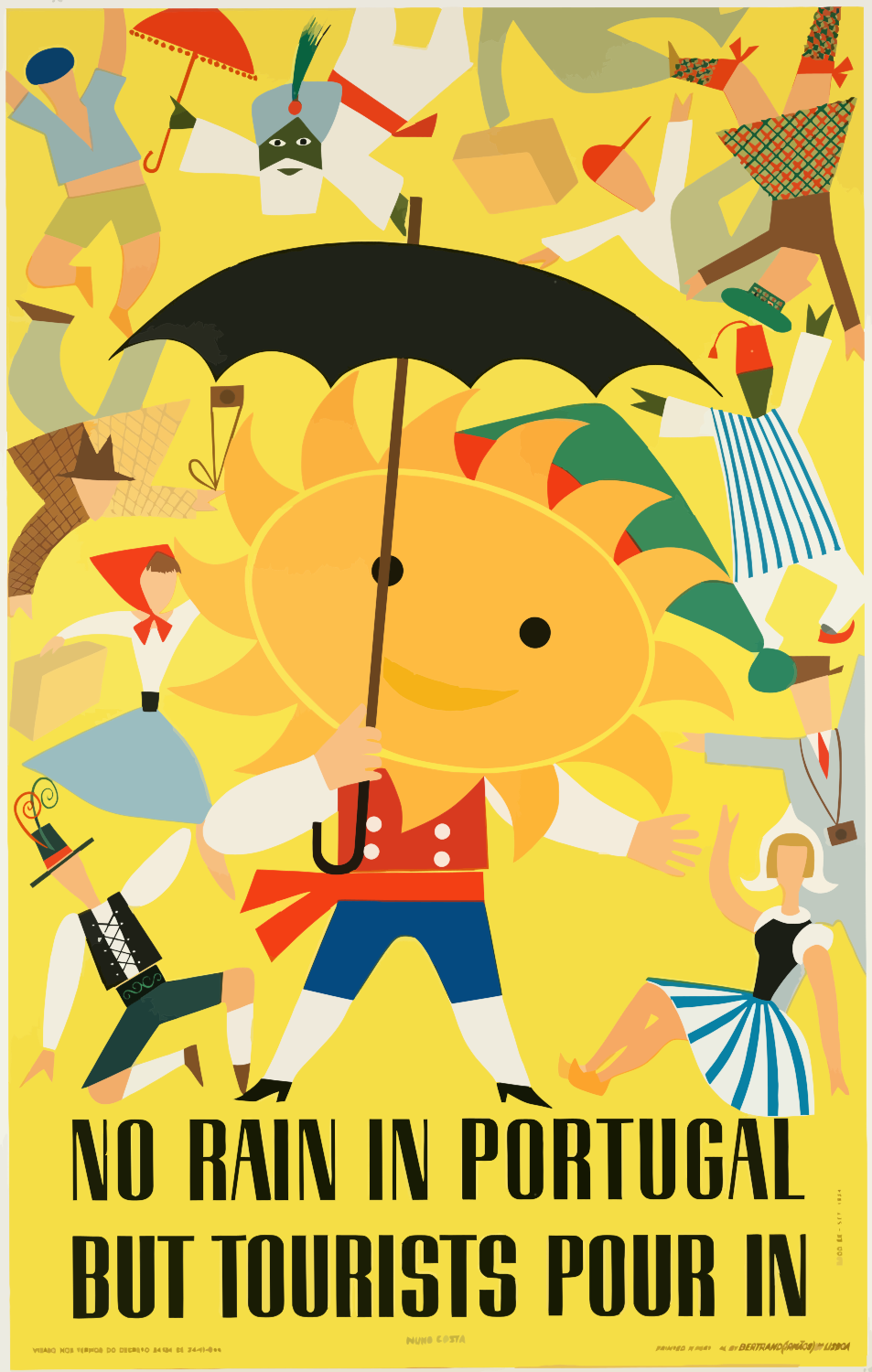This is a colorful poster featuring an umbrella with the phrase "No Rain in Portugal but Tourists Pour In" written on it. The poster is filled with various people, some of whom are holding umbrellas as well. There are at least 13 individuals visible in the scene, each engaged in different activities or poses. Some of them appear to be tourists enjoying their time in Portugal despite the lack of rain. The poster's design is reminiscent of a vintage style, with people and objects arranged in an artistic manner. The combination of the colorful umbrellas and the diverse group of individuals creates a lively atmosphere that reflects the essence of tourism and leisure activities.