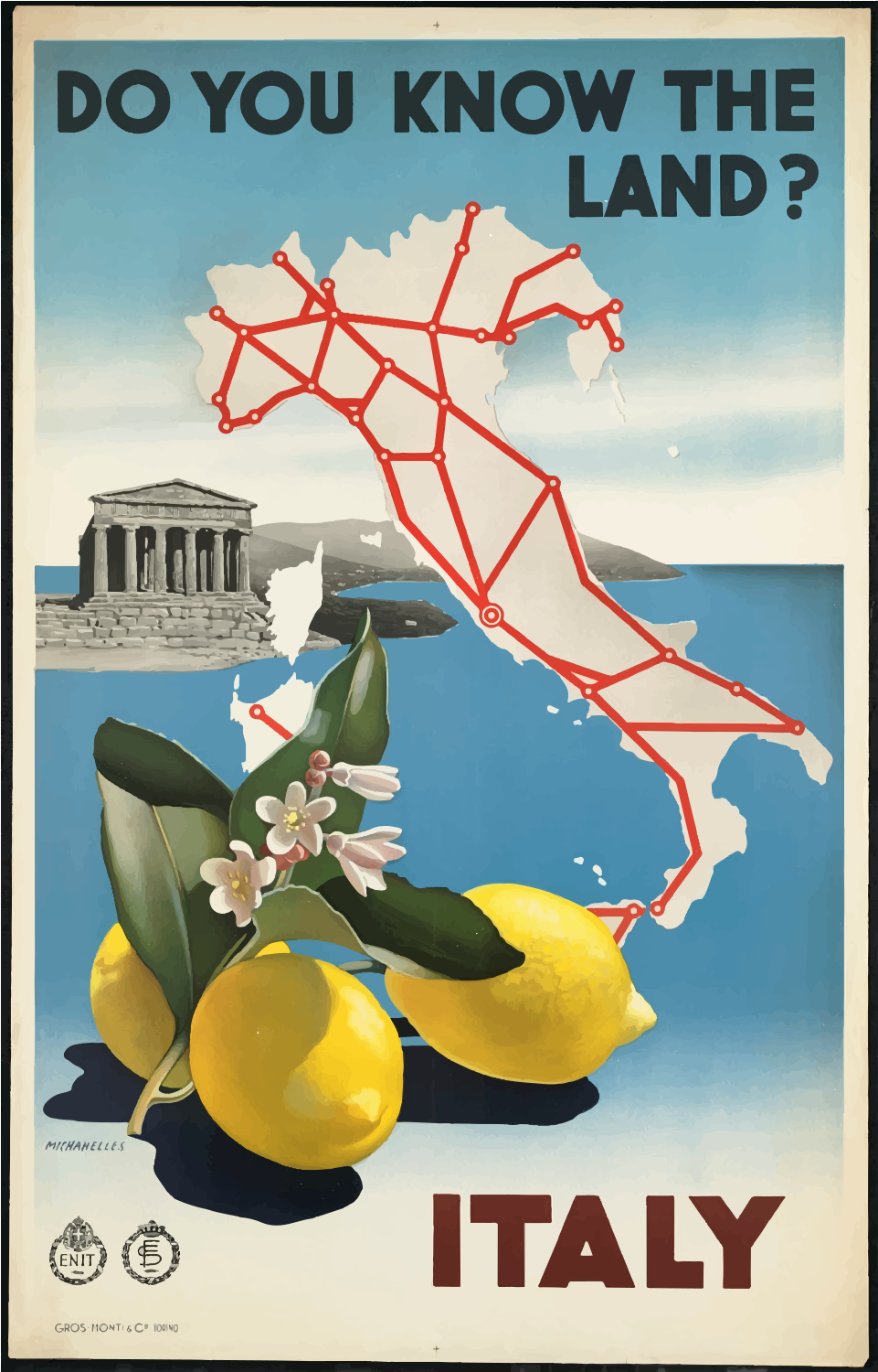 This is a vintage travel poster for Italy, featuring the country's shape with lemons next to it. The word "Italy" is written below the map of the country. The poster also includes an illustration of a building and a road map, indicating that the advertisement is promoting a trip to this European nation. The combination of the map, lemons, and the word "Italy" creates a visually appealing and informative travel advertisement.