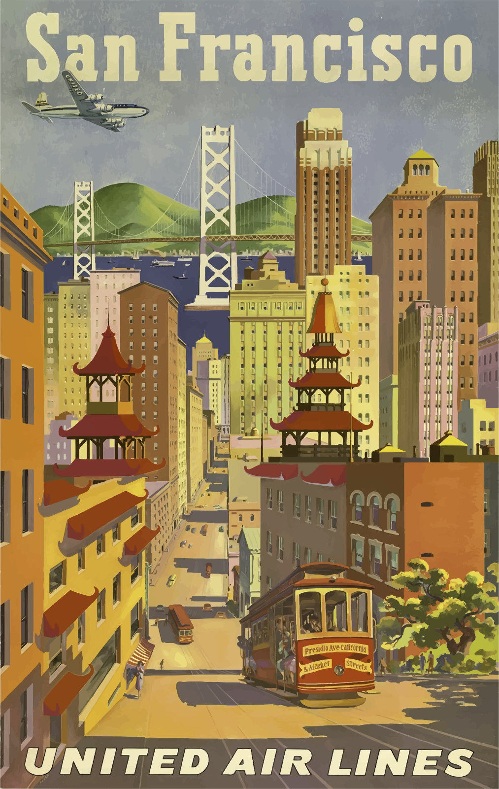 This is a colorful poster featuring the city of San Francisco, showcasing its iconic landmarks and transportation systems. In the foreground, there is a red cable car traveling down the street, surrounded by tall buildings that give the impression of a bustling urban environment. Above the scene, an airplane can be seen flying over the cityscape, adding to the sense of motion and activity in this vibrant metropolis. The poster effectively captures the essence of San Francisco's unique charm and energy through its artistic representation of the city's iconic elements.