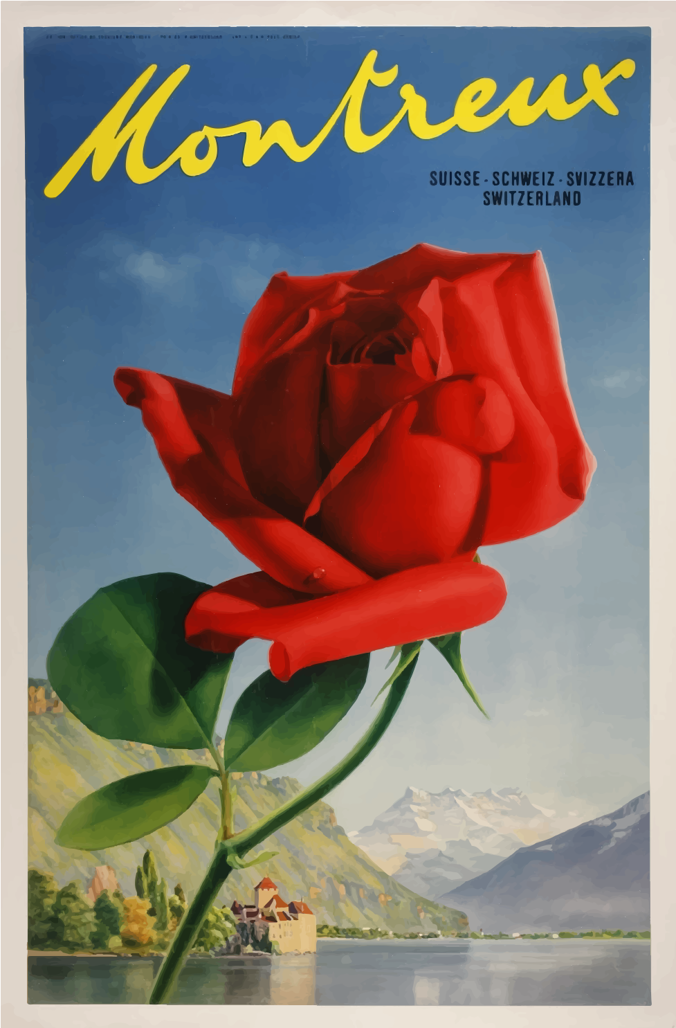 This is a vintage travel poster featuring a red rose with green leaves. The rose is prominently displayed in the center of the poster, and it appears to be the main focus of the advertisement. In addition to the rose, there are several other elements on the poster that contribute to its overall design. A mountain can be seen in the background, adding a sense of depth and natural beauty to the scene. There is also a small house visible near the bottom left corner of the poster, which may represent a local attraction or point of interest for visitors to Montreux. The combination of these elements creates an eye-catching and memorable travel advertisement that showcases the beauty of Montreux and its surroundings.