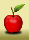 This features a close-up of an apple with a green leaf attached to it. The apple is red in color and has a brown stem, giving the impression that it's ripe and ready for consumption. The leaf appears to be freshly picked from the tree, adding a natural touch to the scene. This artistic representation of an apple showcases its vibrant hue and the beauty of nature.
