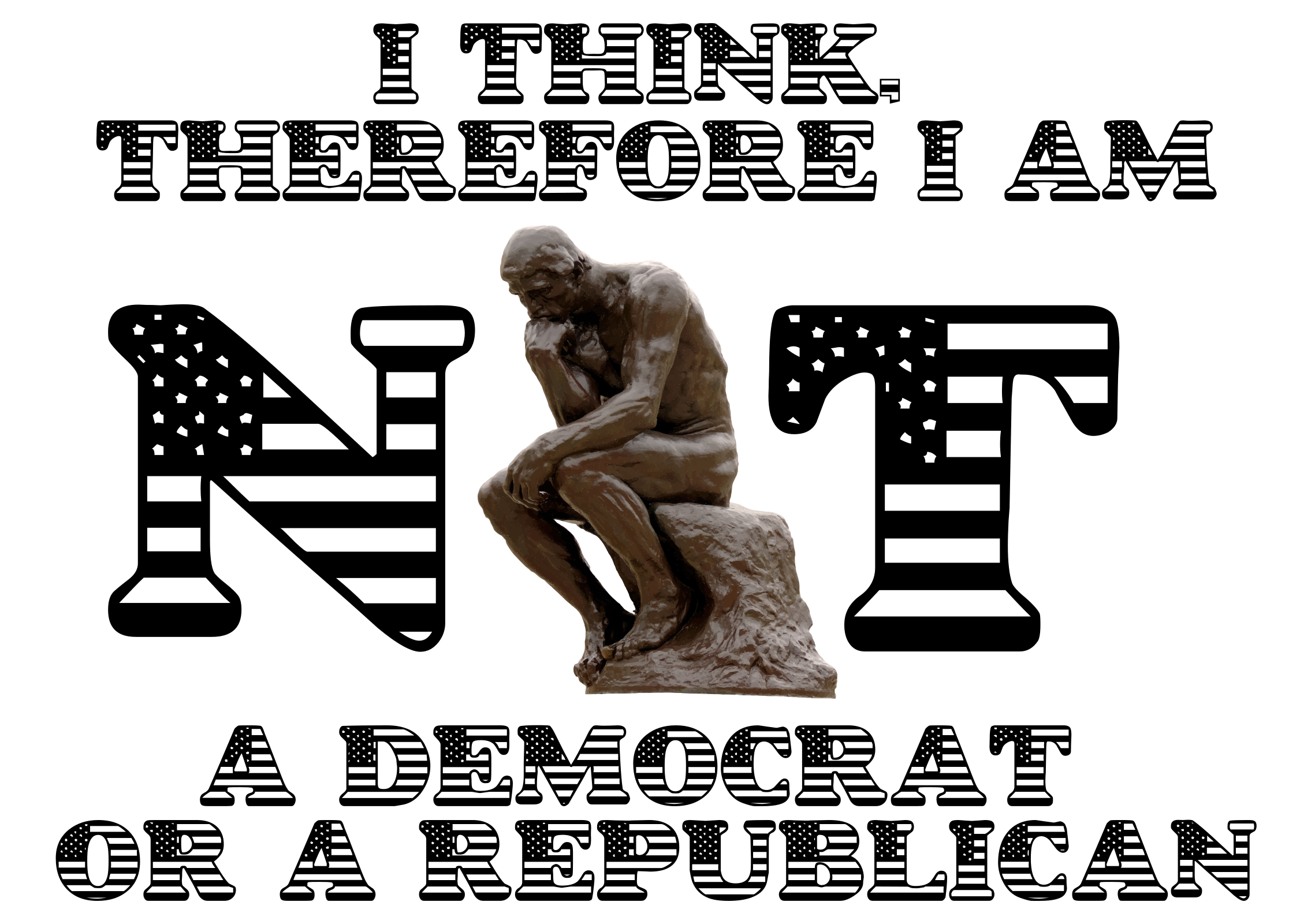 This features a statue of a man sitting on a rock, with the words "I think. Therefore I am not a Democrat or Republican" written below it. This statement is a playful twist on the famous quote by René Descartes, "Cogito, ergo sum," which translates to "I think, therefore I am." The image seems to be making a point about political affiliation and individual thought, suggesting that one's political beliefs should not define their identity.