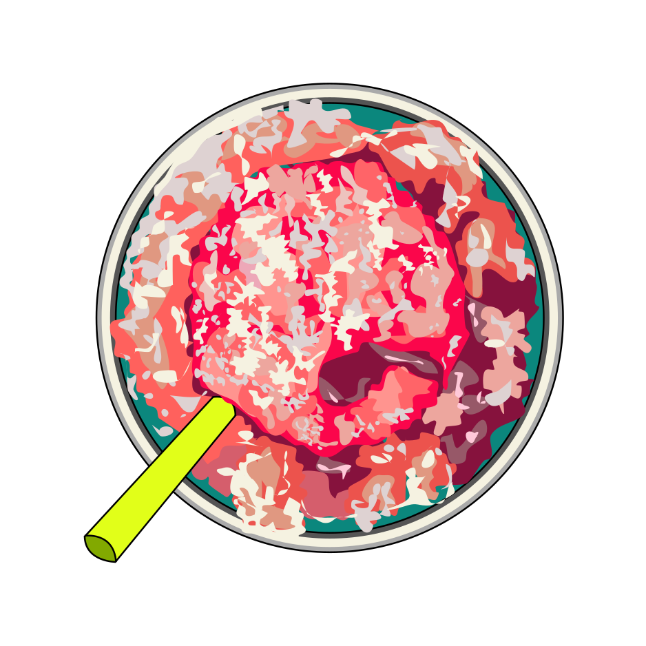 This features a bowl filled with red and pink food, possibly berries or a fruit salad. A yellow spoon is placed inside the bowl, ready to be used for serving the delicious treat. The bowl takes up most of the frame, showcasing its vibrant colors and appetizing appearance. This dish seems like a refreshing and healthy option to enjoy during warm weather or as a snack.