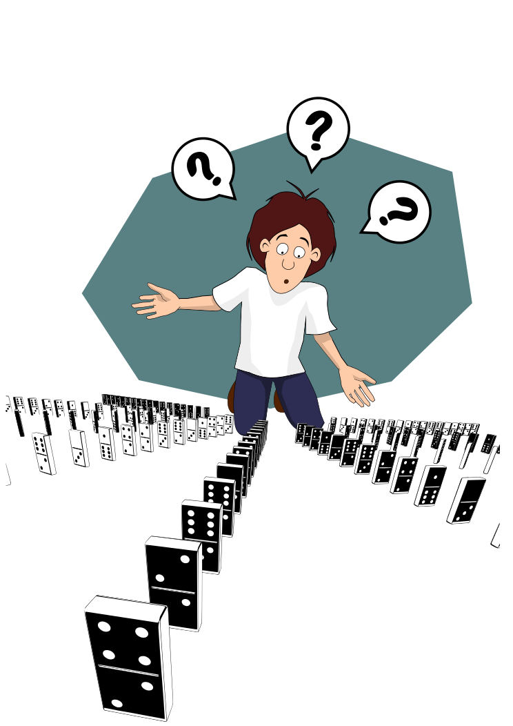 This features a man standing in front of a large pile of dominos, which are arranged in various orientations. He appears to be looking at the dominos with confusion or curiosity, as indicated by the three question marks above his head. The man is wearing a white t-shirt and blue jeans, giving him a casual and relaxed appearance. The scene creates an interesting visual contrast between the organized arrangement of the dominos and the man's seemingly disorganized thoughts or emotions.
