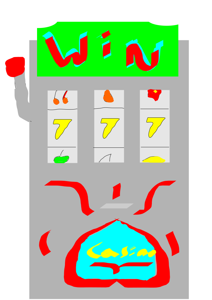 This features a colorful and creative drawing of a slot machine with the words "Win" written on top. The slot machine is filled with various symbols, including multiple cherries scattered throughout the machine. In addition to the cherries, there are also apples and oranges visible in different areas of the machine. The overall design gives off a fun and playful vibe, likely intended to attract potential customers to the casino.