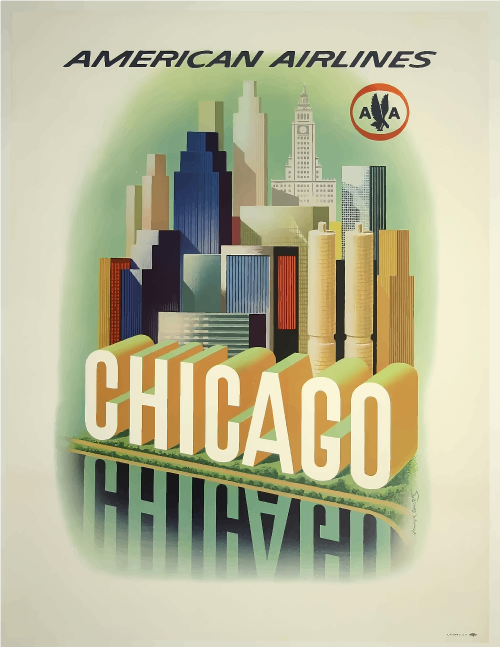 This is a vintage travel poster featuring the city of Chicago, Illinois. It showcases an American Airlines advertisement with a large "Chicago" sign in bold letters. The poster also includes several buildings and skyscrapers surrounding the cityscape, giving it a bustling urban feel. In addition to the main text, there is a small logo for American Airlines located at the top of the poster. Overall, this vintage travel poster captures the essence of Chicago's skyline and its iconic architecture.