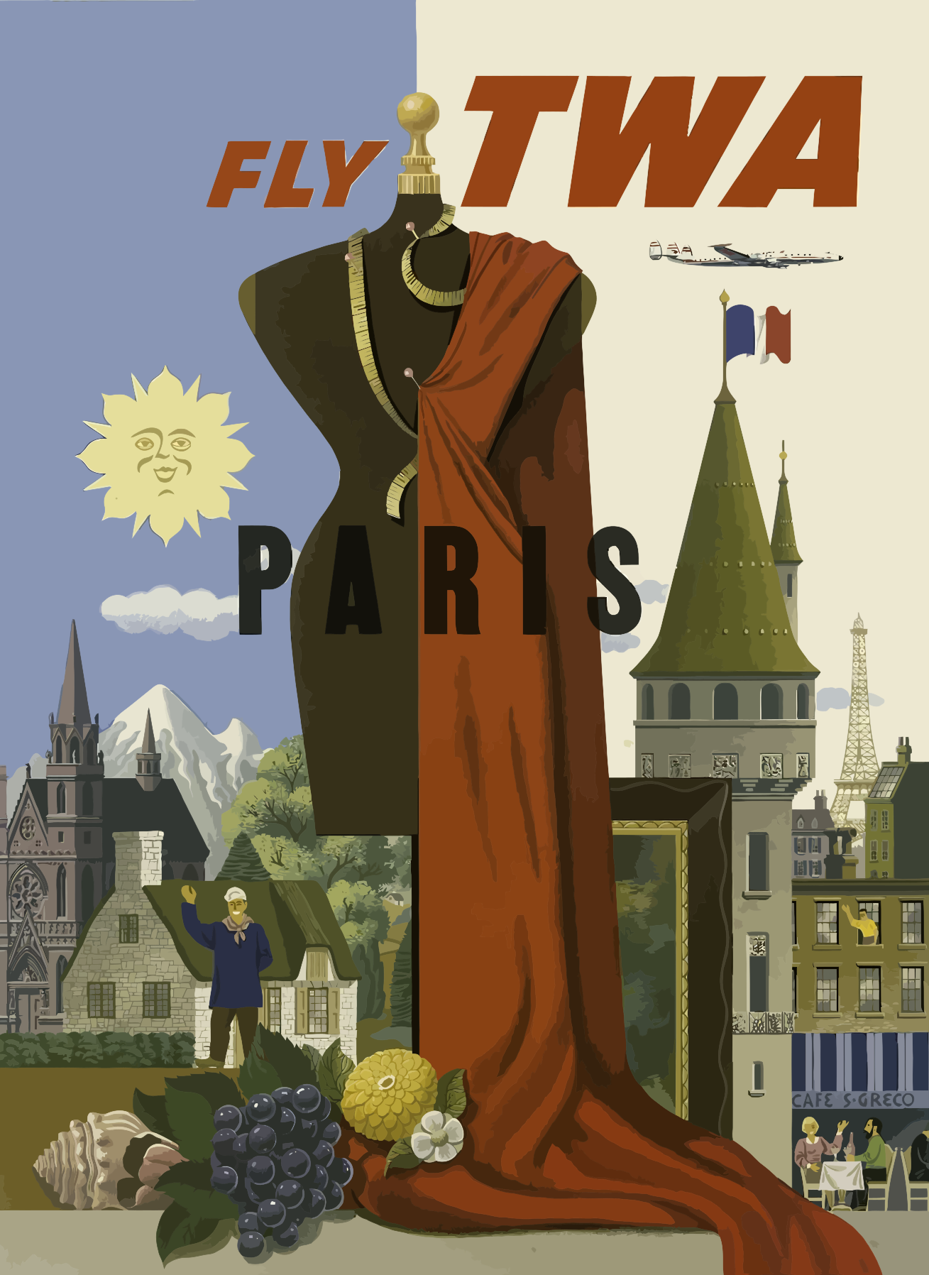 This is a vintage poster advertising a trip to Paris. It features an illustration of a mannequin wearing a red cape, standing in front of the Eiffel Tower. In addition to the mannequin and tower, there are several other elements on the poster that add to its charm. These include a book, a clock, a bowl of fruit, and a wine glass. The overall composition of the poster is visually appealing and inviting, making it an attractive advertisement for a trip to Paris.