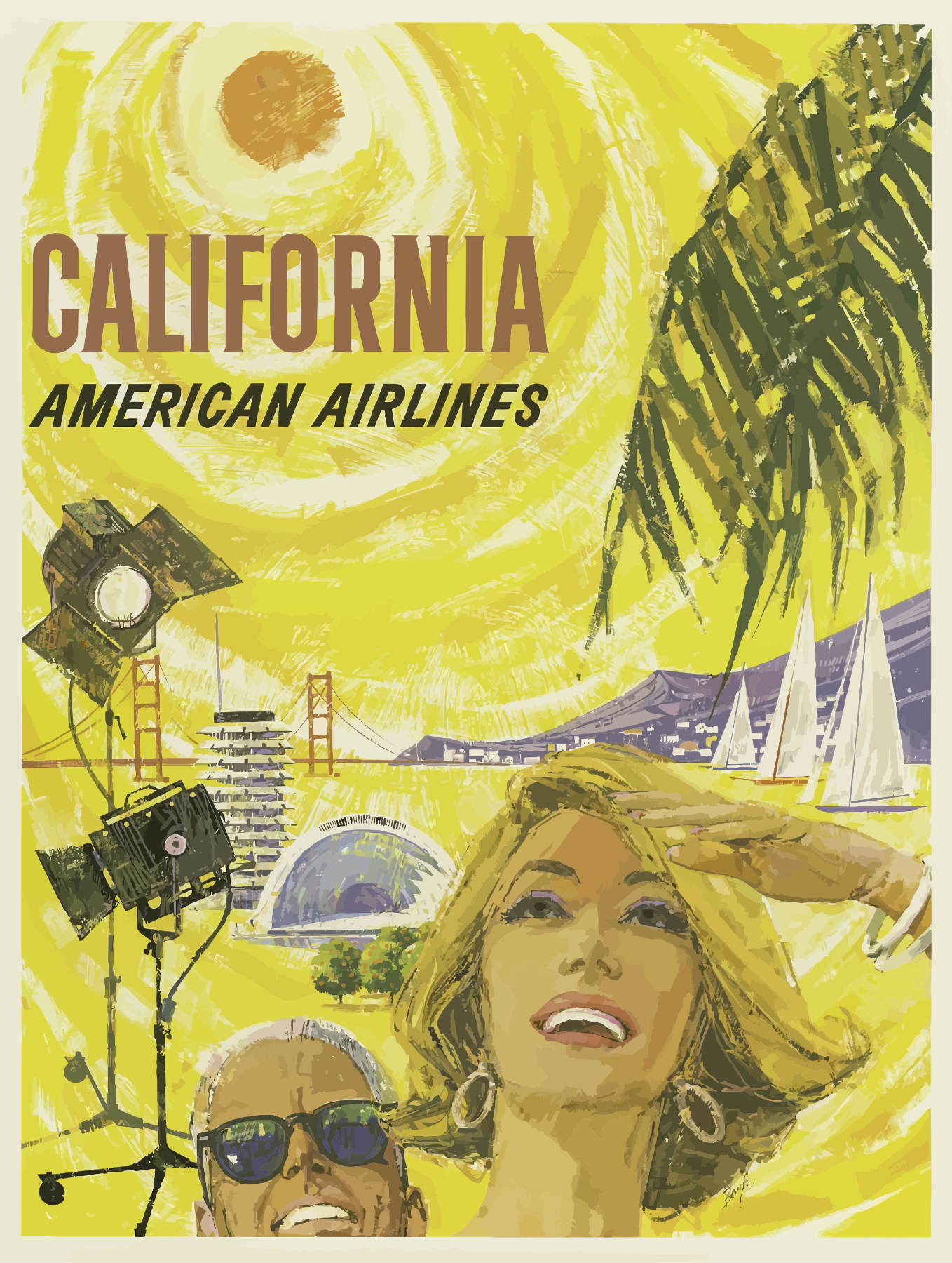 This is a colorful poster featuring an advertisement for American Airlines. In the center of the poster, there are two people standing next to each other with their arms around one another. They appear to be enjoying themselves as they pose for the picture. Behind them, there are several boats visible in the background, adding to the overall ambiance of the scene. The advertisement is set against a yellow backdrop that complements the vibrant colors of the poster.