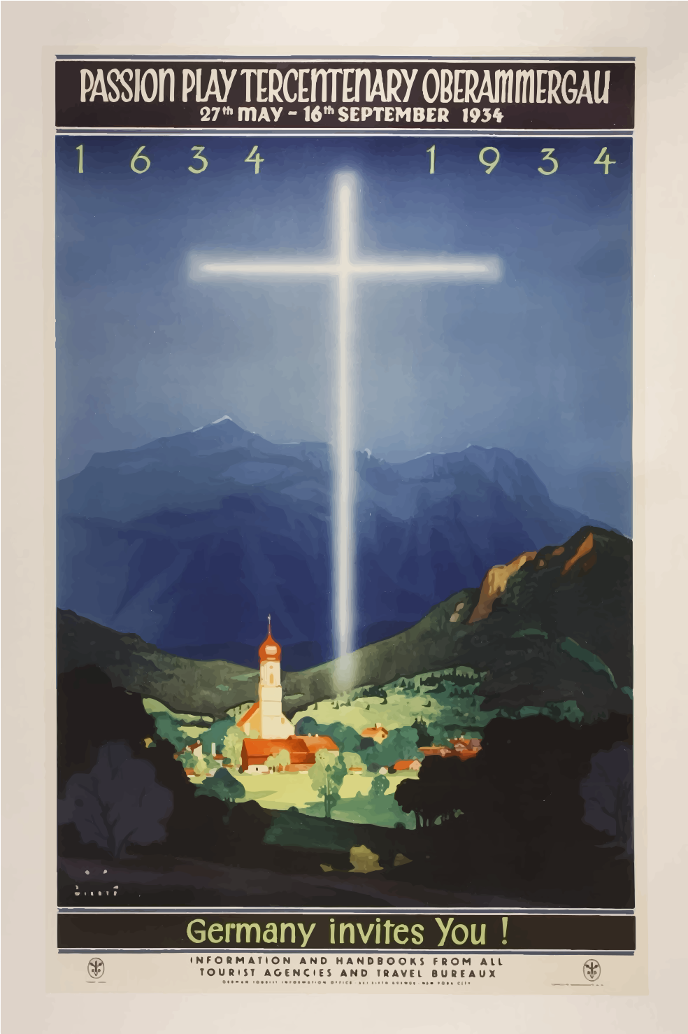 This is a colorful poster featuring a large cross standing in the middle of a village. The scene appears to be set in Germany, with mountains visible in the background and a church nearby. There are several people scattered throughout the village, some closer to the foreground while others are further away. A few cars can also be seen parked or driving through the area. The overall atmosphere suggests a lively and picturesque location that is inviting to visitors.