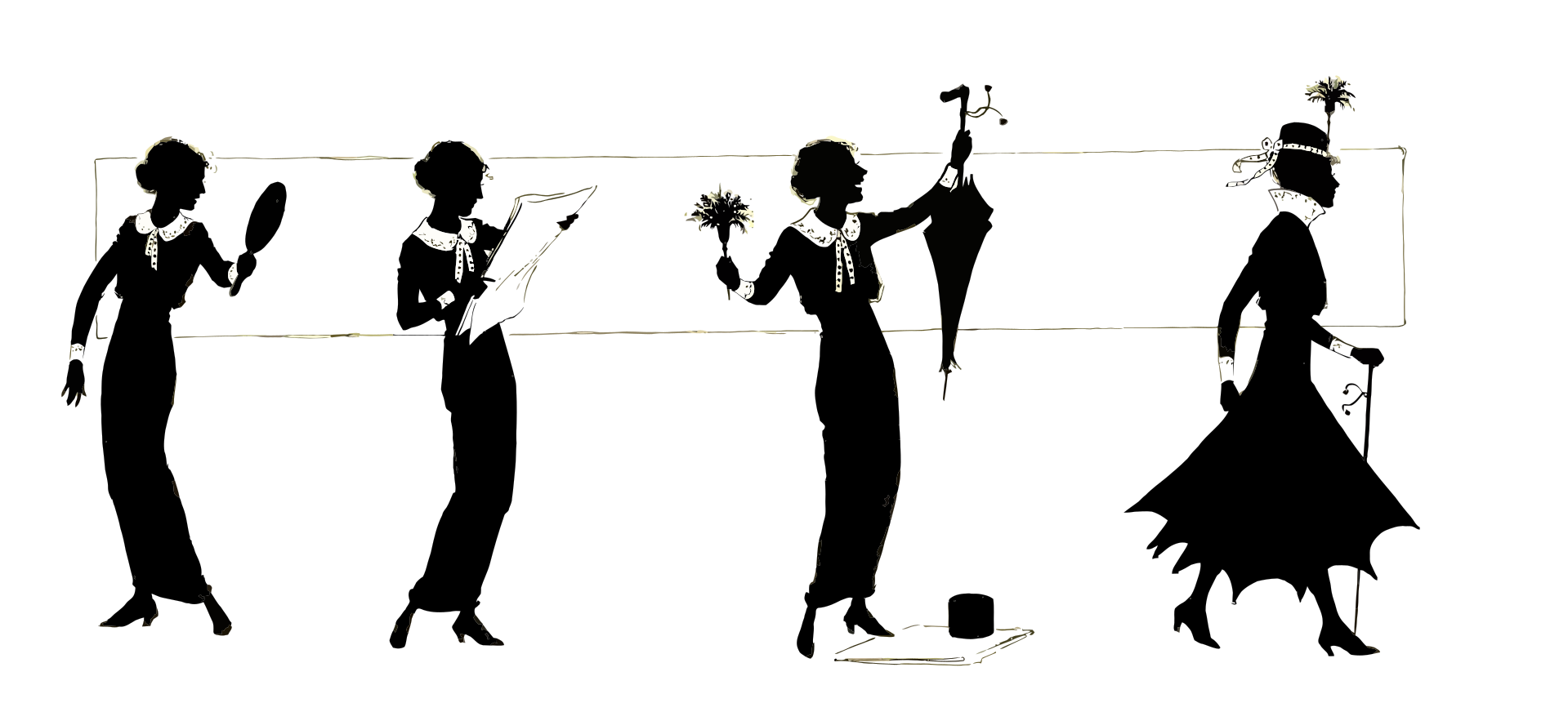 This features four silhouettes of women in vintage clothing, each posing in different ways. They are all dressed elegantly and appear to be wearing dresses or skirts. One woman is holding a handbag, while another has a tennis racket. A third woman is holding a parasol, adding an element of sophistication to the scene. The fourth silhouette appears to be dancing, showcasing her grace and poise. Overall, the image captures the elegance and charm of these women in their vintage attire.