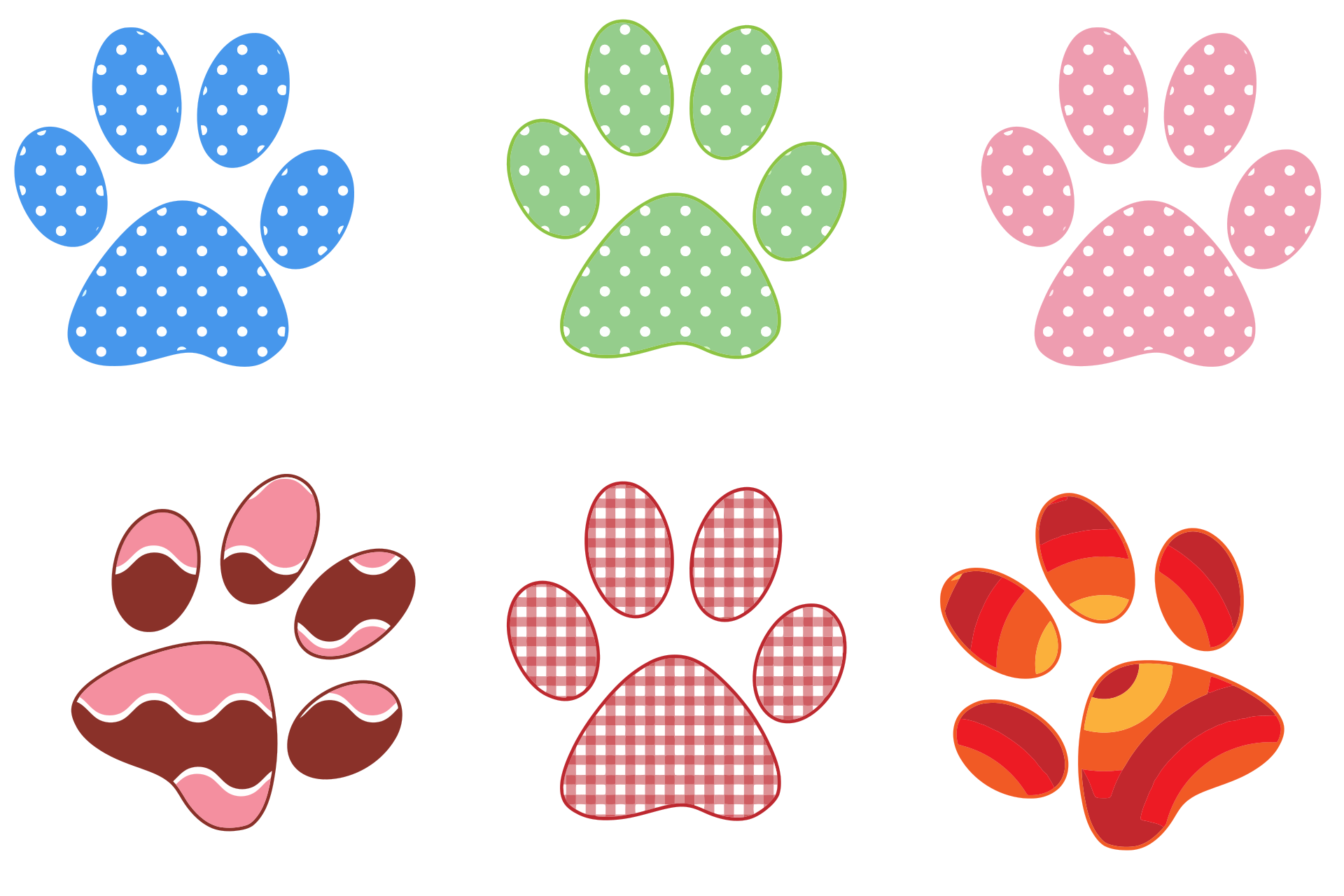 This features six different colored paws, each with a unique design. These paws are arranged in a row and come in various colors such as blue, green, yellow, orange, red, and pink. Each paw is adorned with polka dots, adding to the visual appeal of the image. The combination of these vibrant colors and patterns creates an eye-catching display that showcases the creativity behind the design.