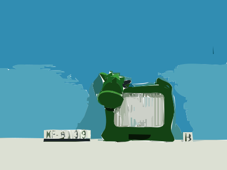 This features a green object with a white face, which appears to be an old-fashioned device. It is placed on a table or countertop in front of a blue sky background. There are two labels visible near the object, one reading "MF 1951" and another that reads "HB 31". The overall scene gives off a vintage feel with the combination of the green device and the blue sky in the background.