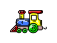 This features a colorful cartoon train with a yellow and blue engine, sitting on top of tracks. It appears to be an icon or a symbol, as it is depicted in a simple outline format. The train's design gives the impression that it could be used for transportation or play purposes. The overall appearance of the image suggests a fun and whimsical theme, with the cartoon-like train being the main focus.
