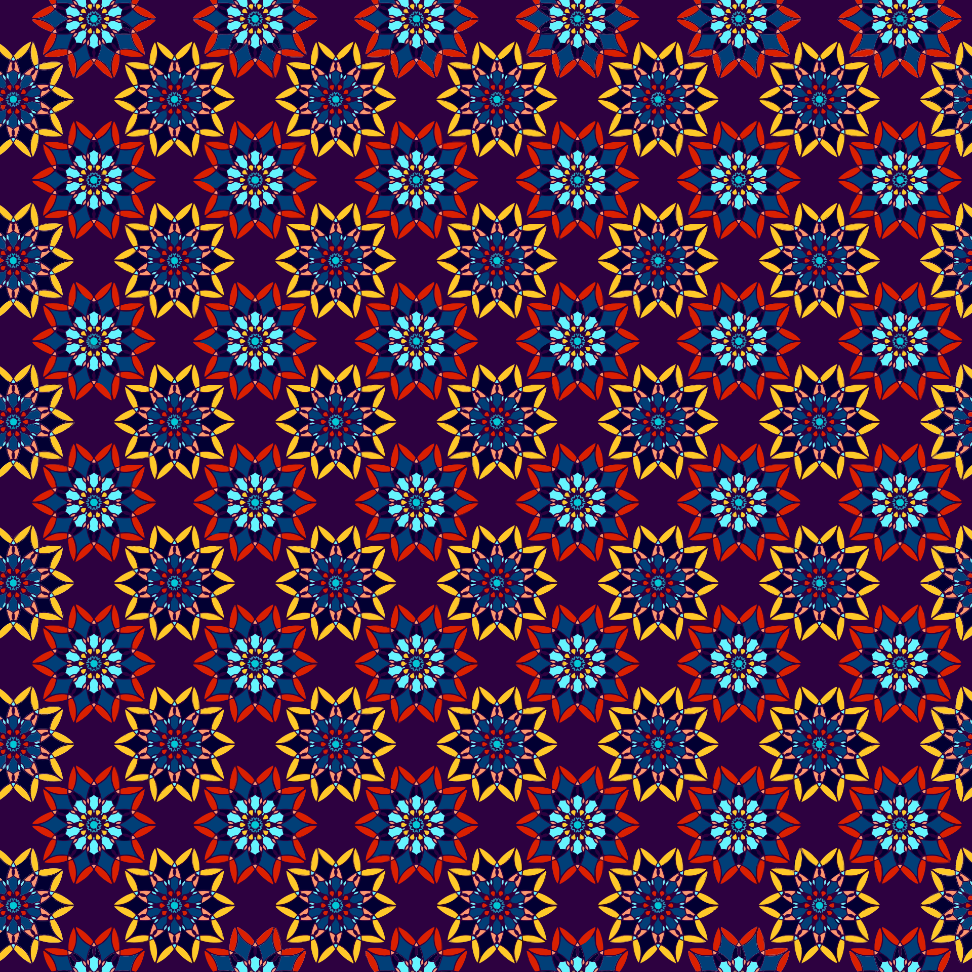 This features a vibrant and colorful pattern of blue, yellow, red, and purple flowers. These flowers are arranged in an intricate design that covers the entirety of the image. The colors used in this pattern create a visually striking contrast against each other, making it an eye-catching piece of artwork. The combination of these different colored flowers creates a unique and captivating visual experience for anyone who sees it.