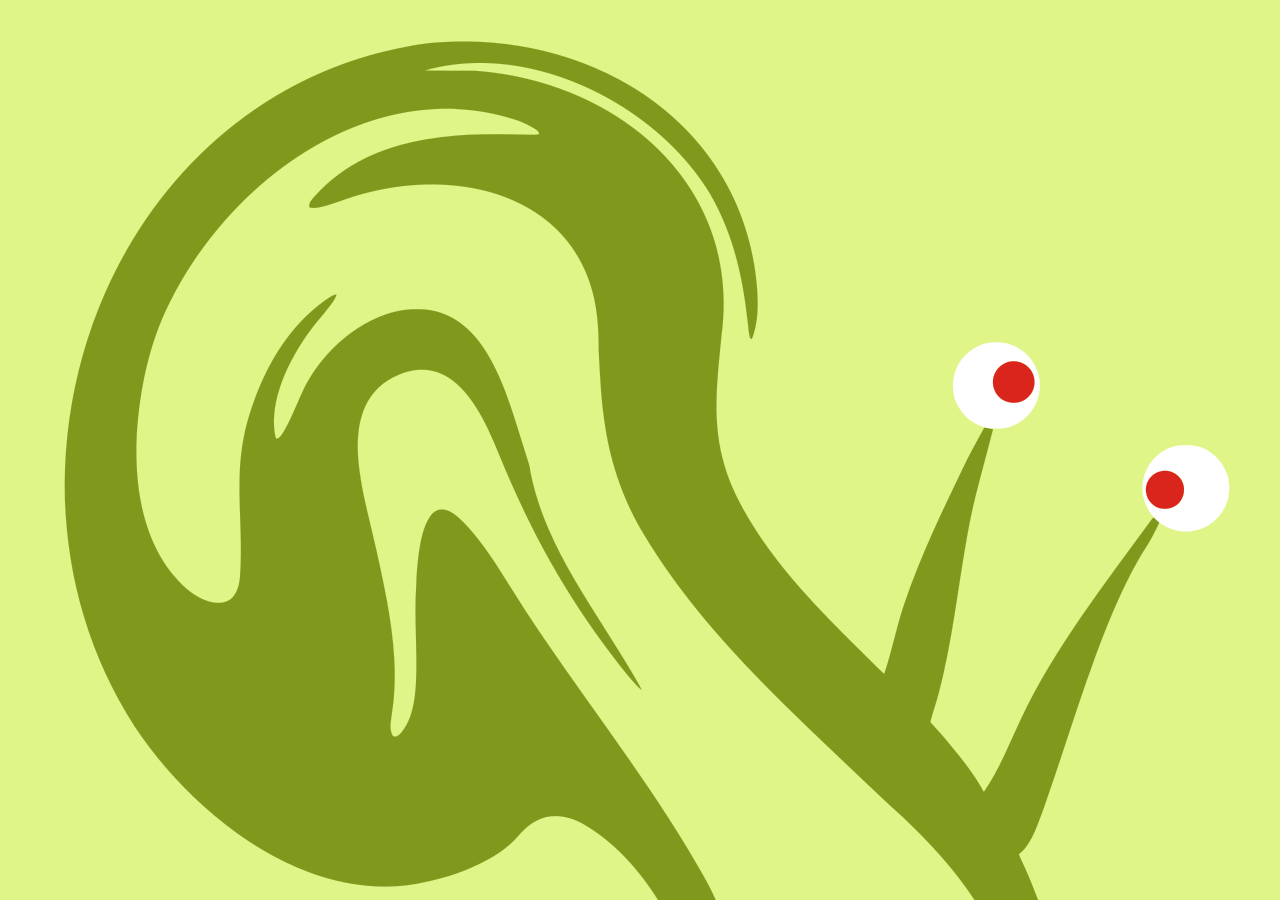 This features a green and yellow cartoon snail with two red eyes, giving it an animated appearance. It is situated on top of a bright green background that contrasts well with the vibrant colors of the snail. The snail's body occupies most of the frame, while its head extends slightly to the left side. The two red eyes are placed in the upper right corner and lower left corner of the image, adding an element of playfulness to the scene. Overall, it is a fun and engaging illustration that captures the viewer's attention with its unique design.