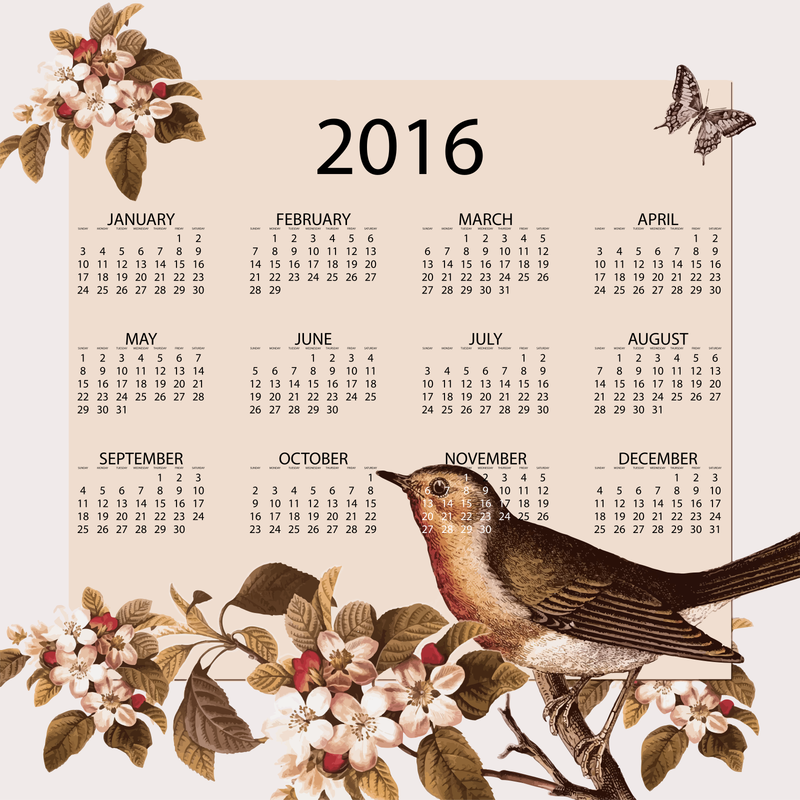 This is a completely free image Vintage Bird And Floral 2016 Calendar that you can download, post, and use for any purpose.
