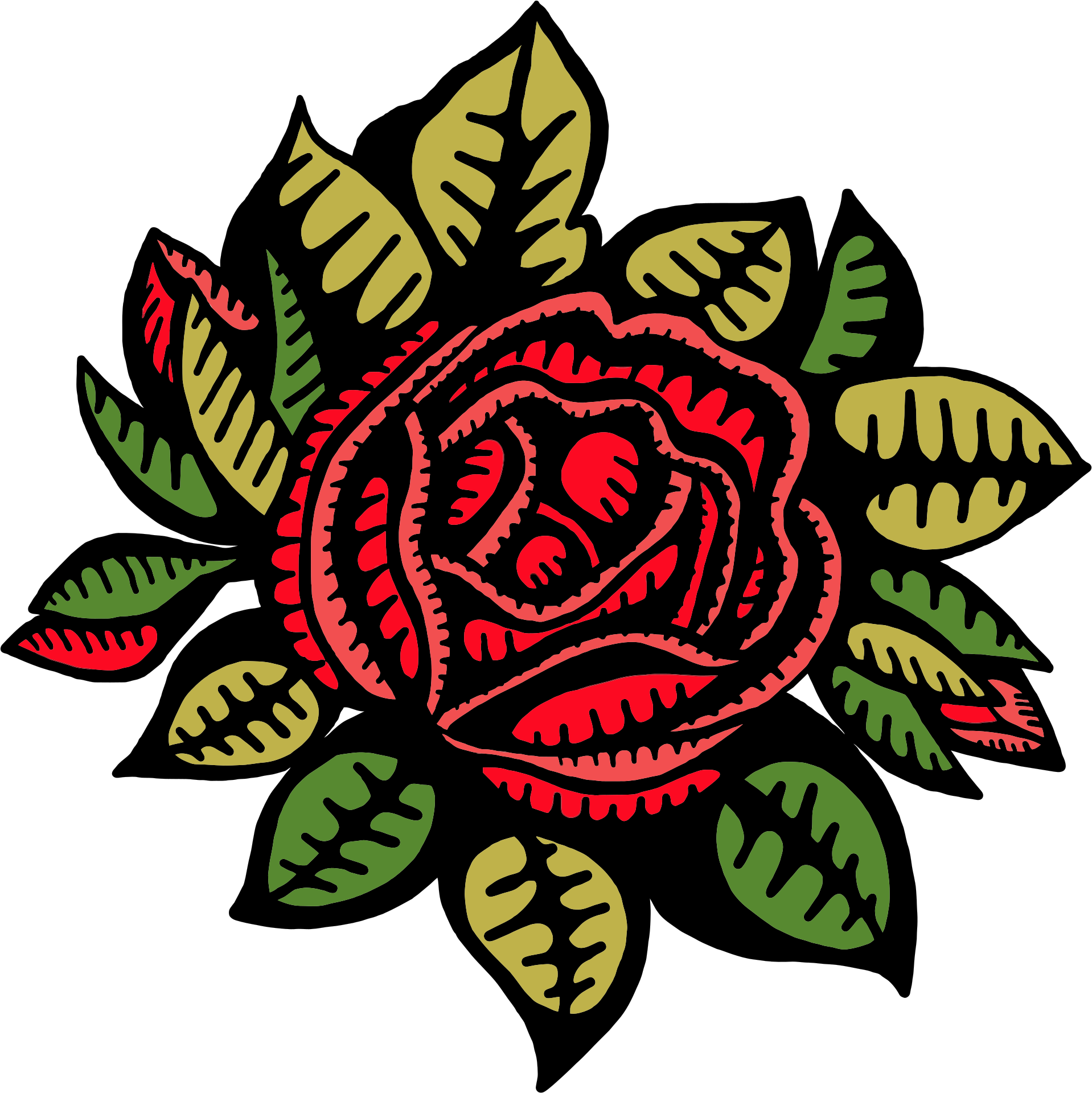 This features a large, colorful red rose with green leaves. The rose is the central focus of the picture and appears to be the main subject. The leaves surrounding the rose are intricately detailed, adding depth and texture to the overall design. The combination of the vibrant red hue of the rose and the lush greenery creates a striking visual effect that captures attention. This artistic representation of a rose with green leaves could be used in various contexts such as wall decorations or even as part of a logo, showcasing its beauty and elegance.