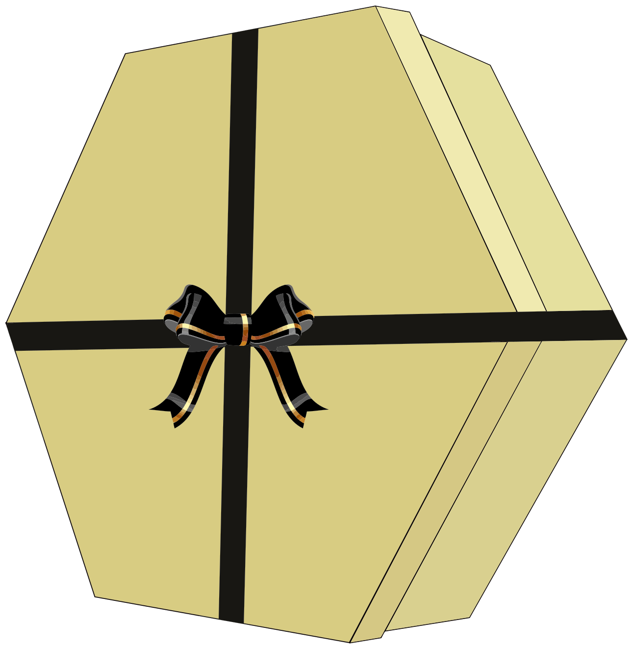This features a yellow box with a black ribbon tied around it, giving the appearance of a gift. The box is shaped like a pentagon and has a bow on top, adding to its presentation as a thoughtful present. The combination of the vibrant yellow color and the contrasting black ribbon creates an eye-catching visual effect that makes this gift stand out.